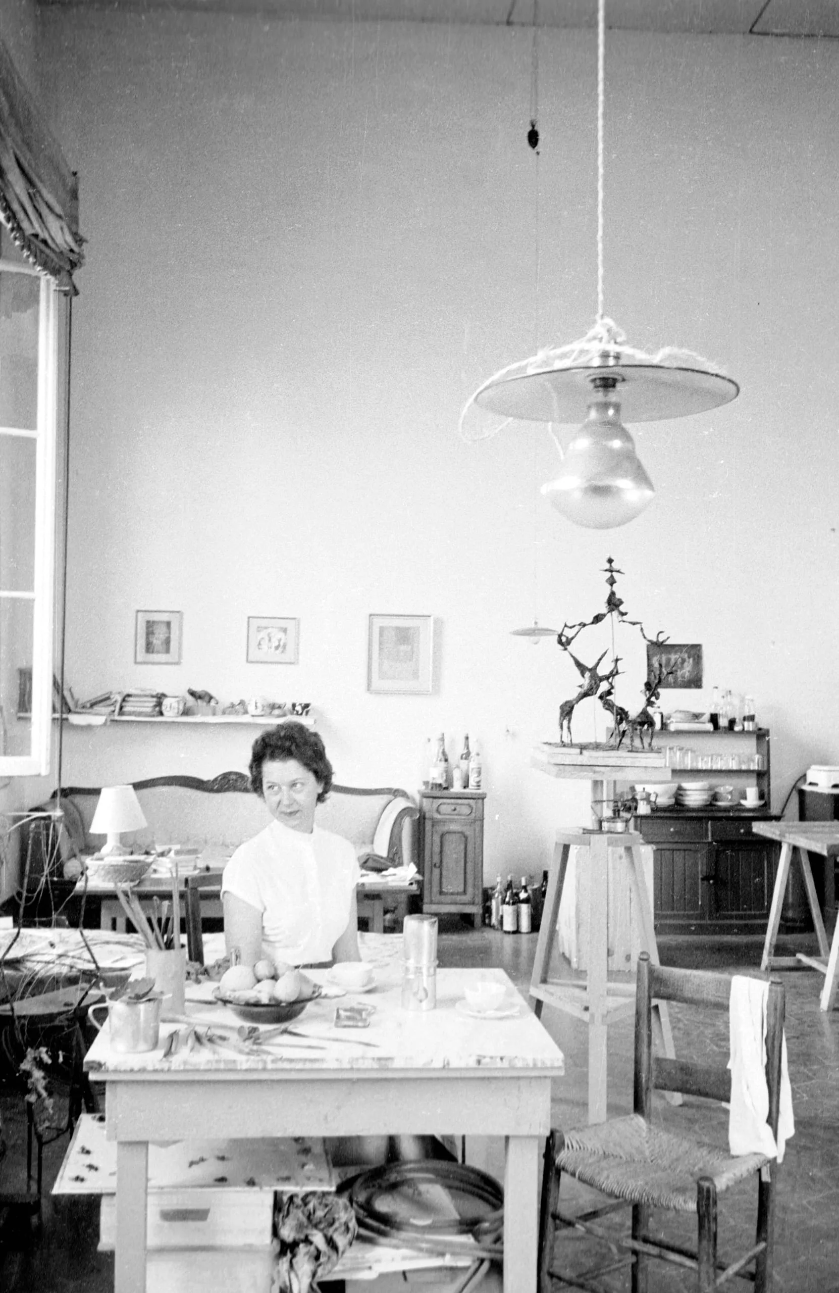 Black and white photograph of a woman in a white blouse seated at a paint-stained worktable in a large studio room, with a pendant lamp overhead and a bronze deer sculpture in the background