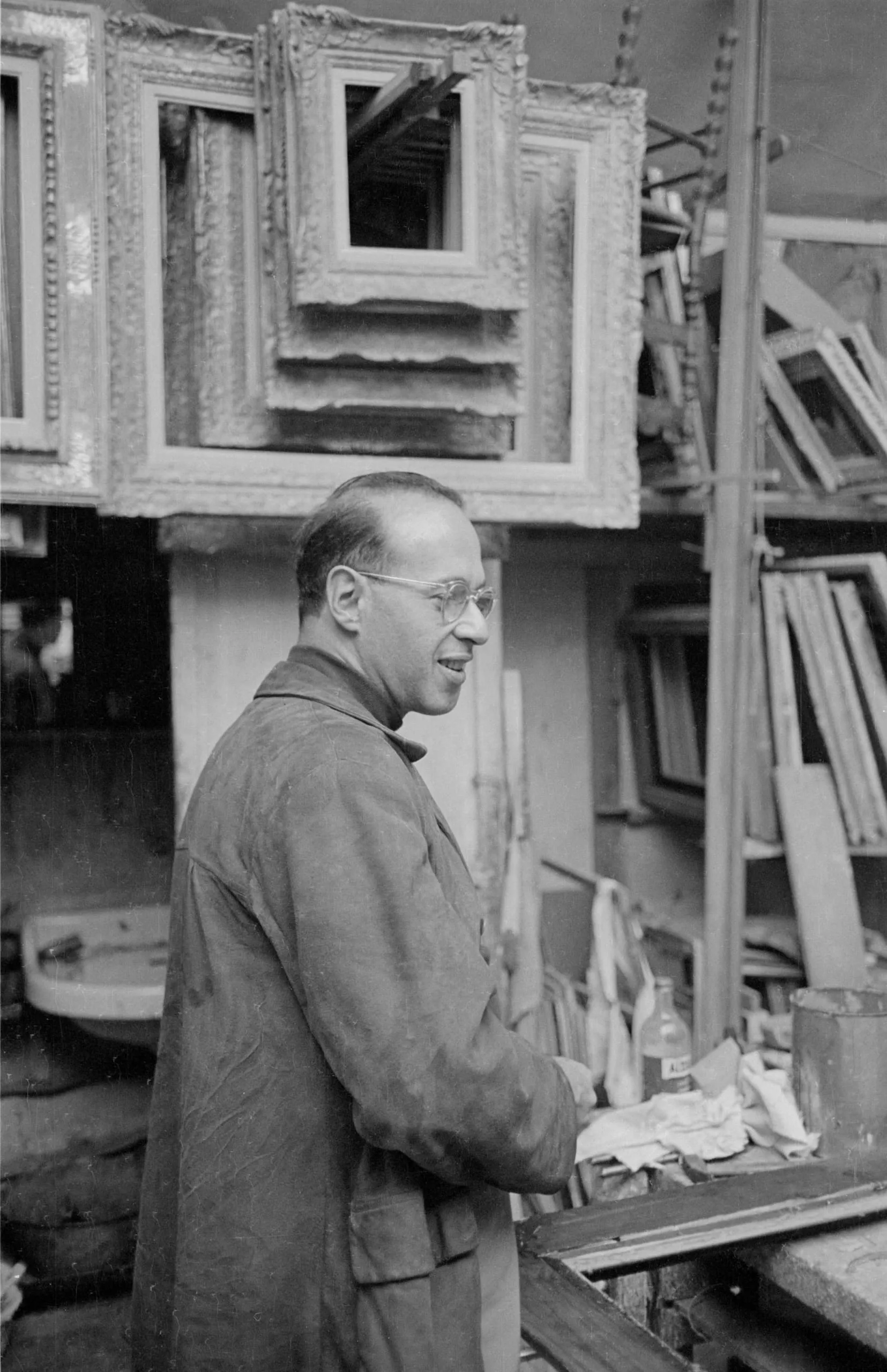 Black and white photograph of a white man in a work smock, shown in profile, standing among stacked empty picture frames in a cluttered workshop