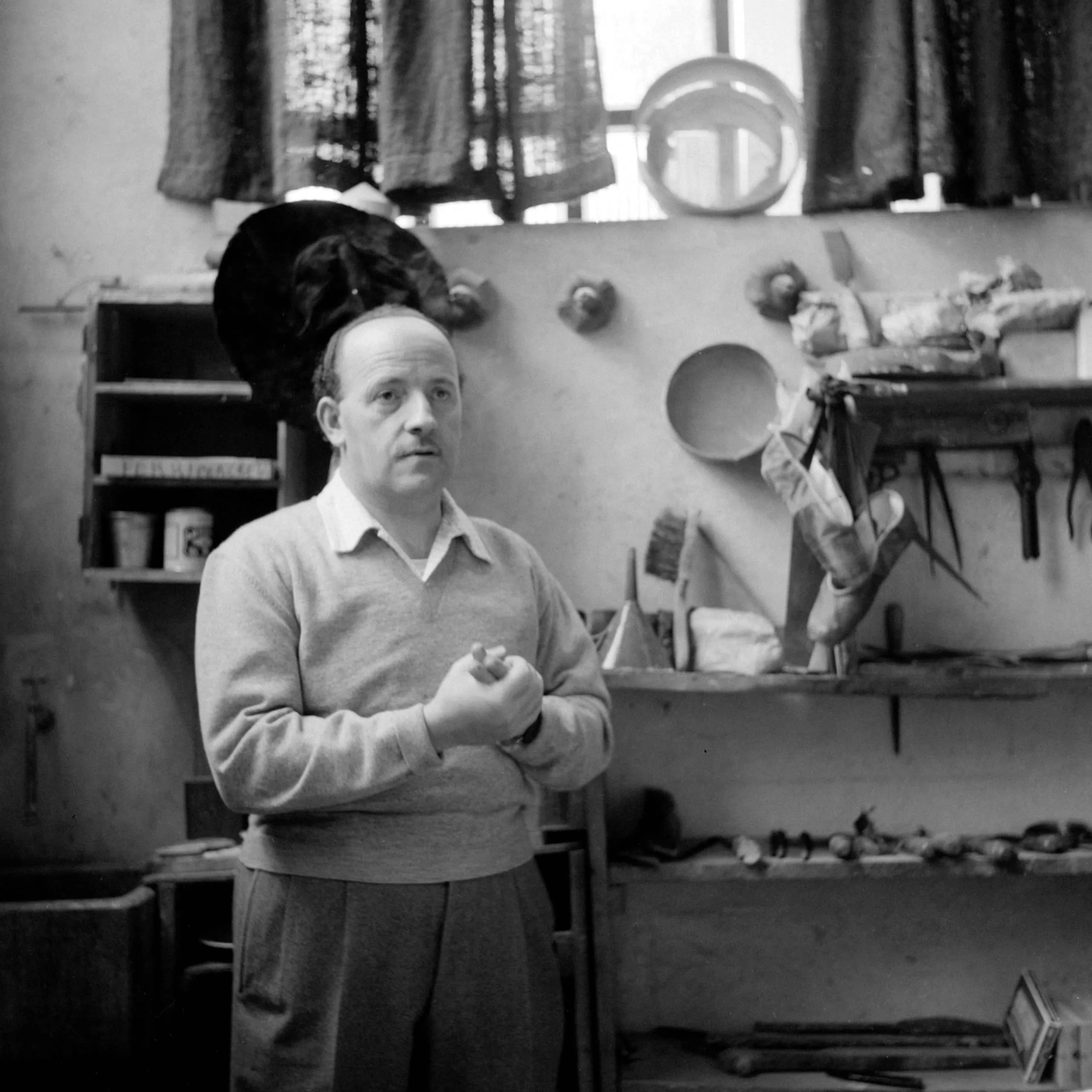 Black and white photograph, white man in a crew-neck sweater standing in a cluttered workshop, hands clasped, facing the camera