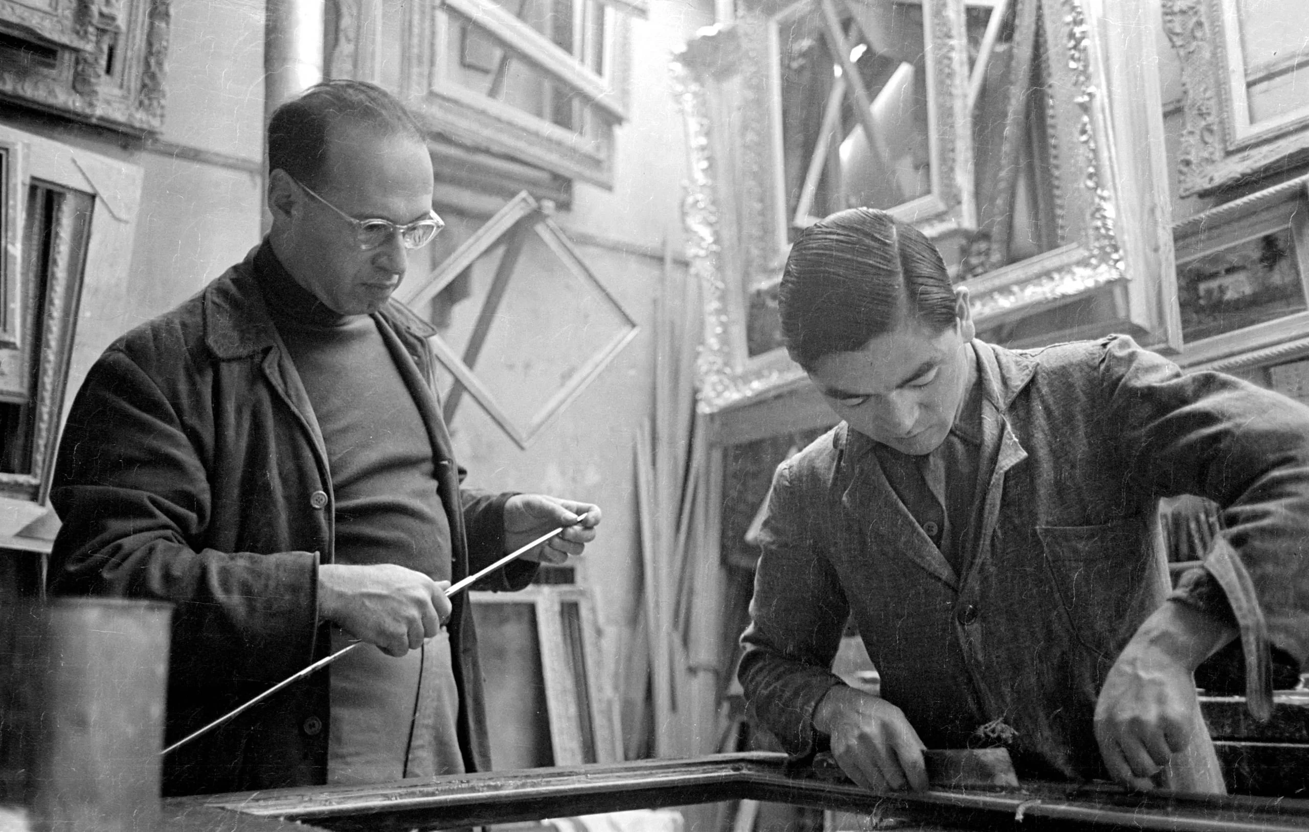 Black and white photograph of two men examining or working on a framed object in a room crowded with picture frames and gilded molding