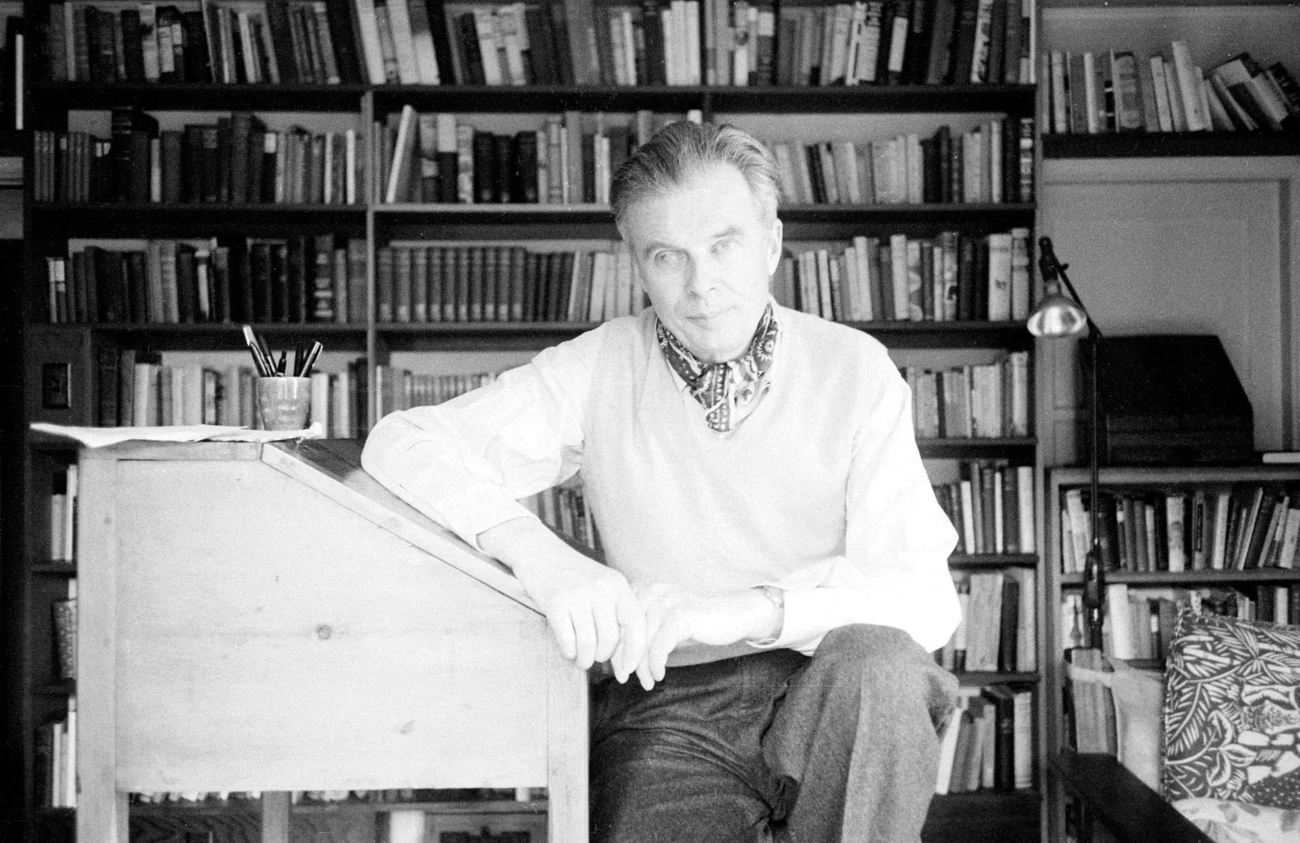 Black and white photograph of a man seated at a wooden drafting desk, leaning on its slanted surface, with floor-to-ceiling bookshelves behind him