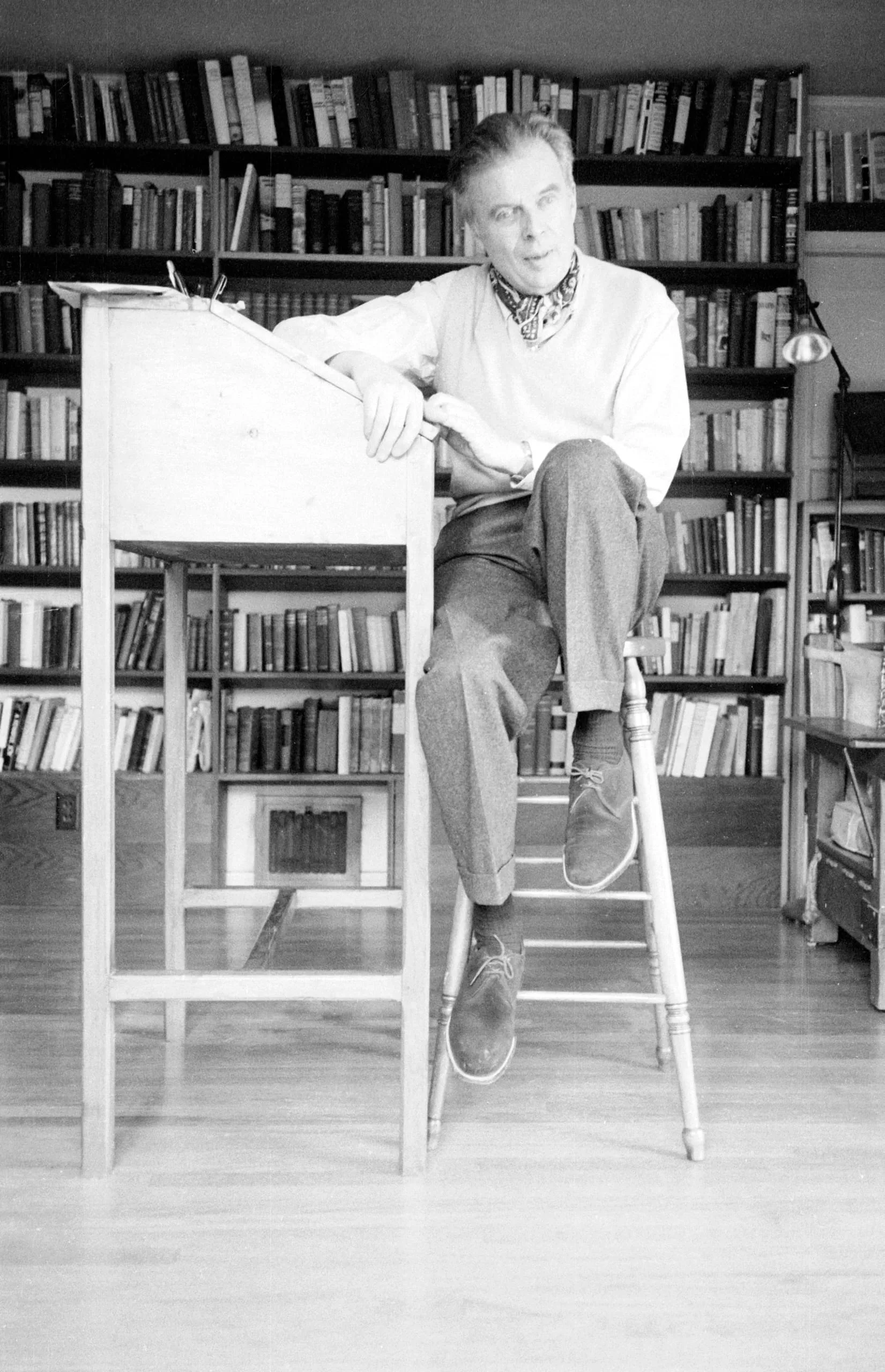 Black and white photograph, full-length portrait of a man in a light sweater and cuffed trousers seated on a tall wooden stool beside a drafting desk, with packed bookshelves behind him