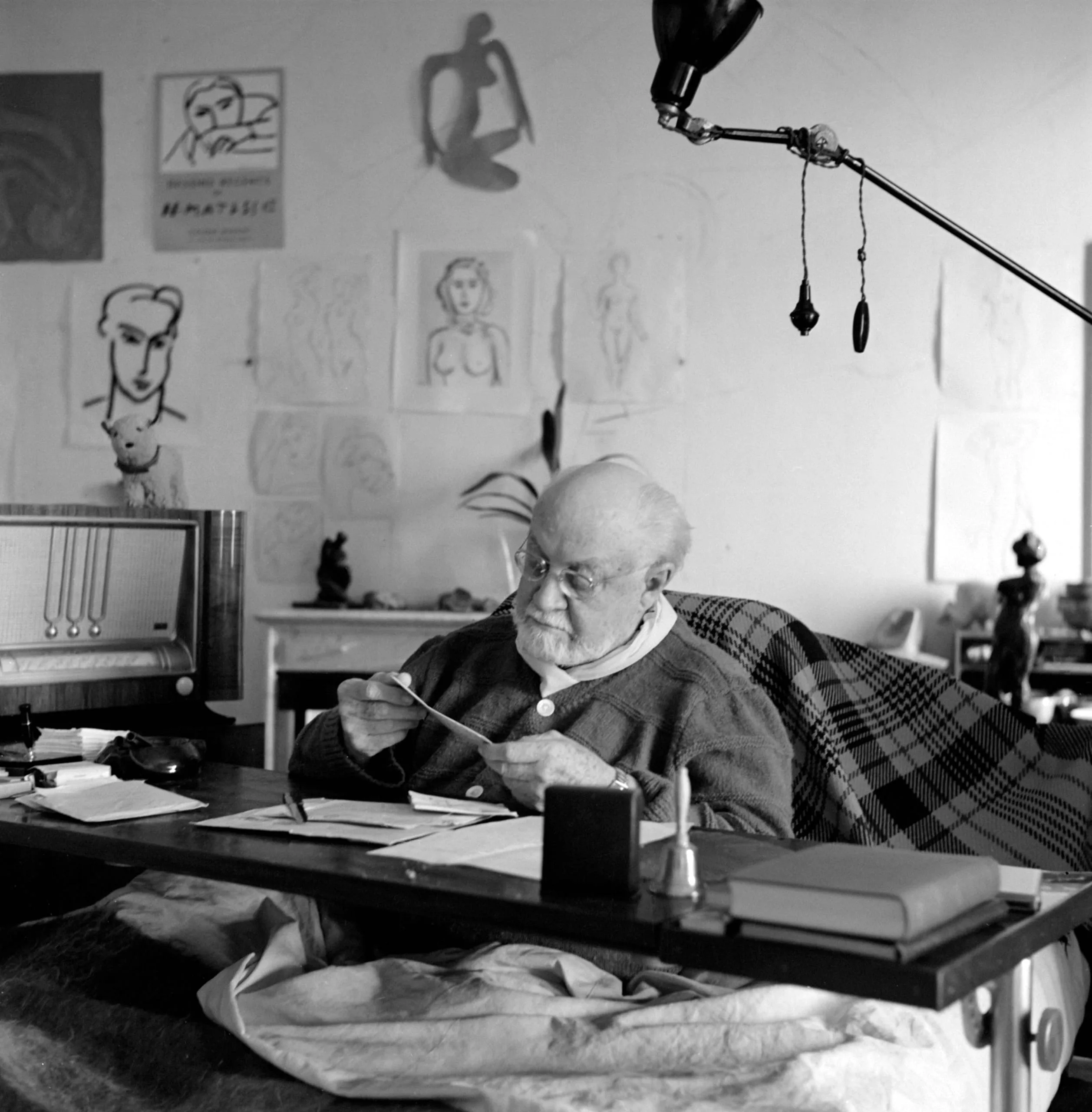 Black and white photograph of an elderly bald man with a white beard and round glasses, seated at a cluttered desk, holding a long drawing tool, with figure drawings pinned to the wall behind him
