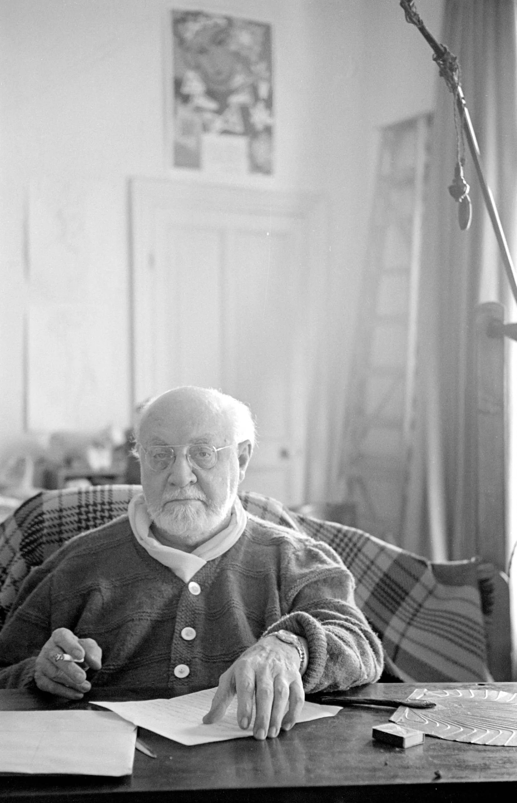 Black and white photograph of an elderly white man with a white beard and glasses, seated at a desk holding a pencil, papers in front of him, in a softly lit room