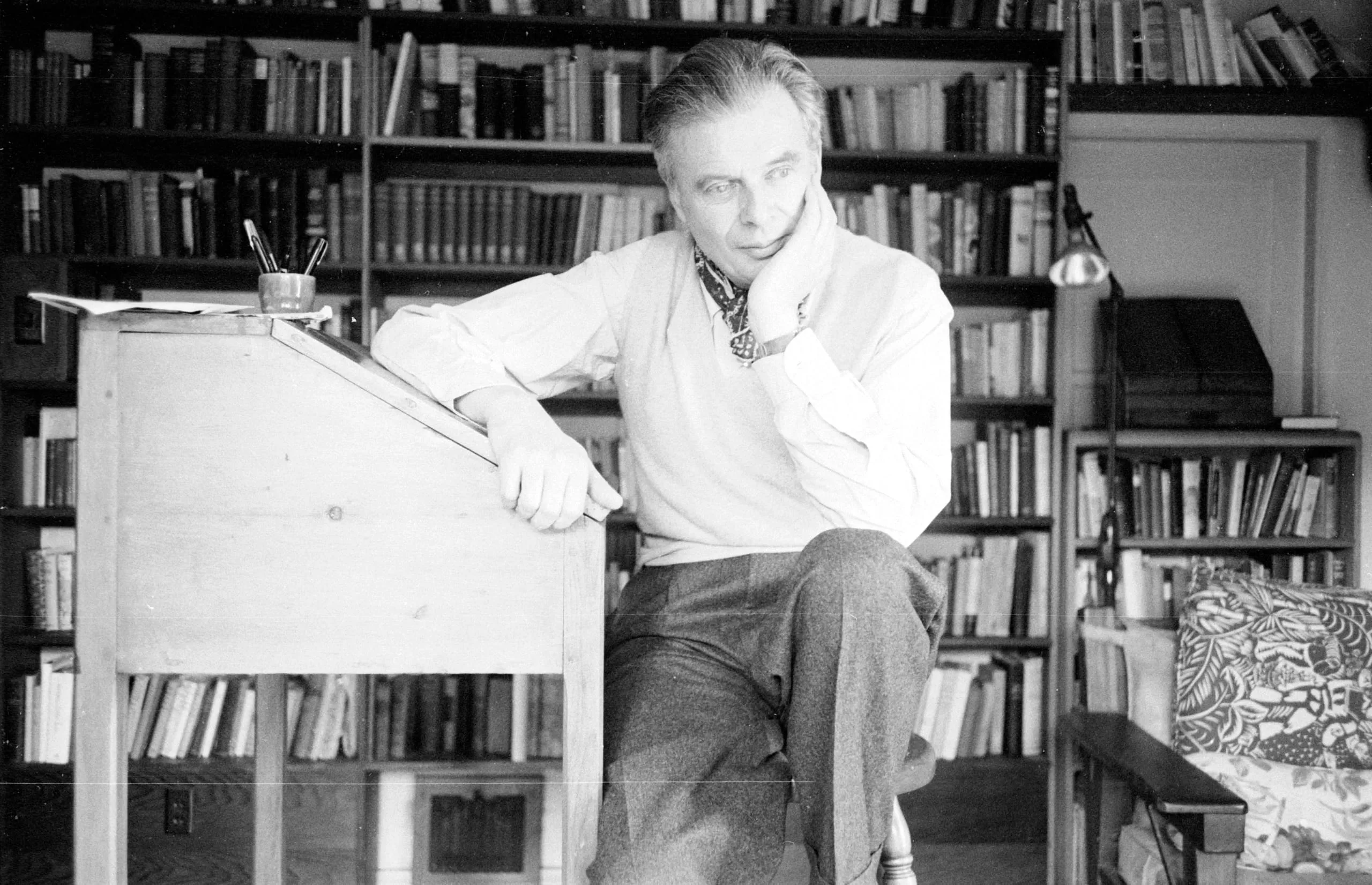 Black and white photograph of a white man in a sweater vest seated beside a wooden drafting table, bookshelves filling the wall behind him