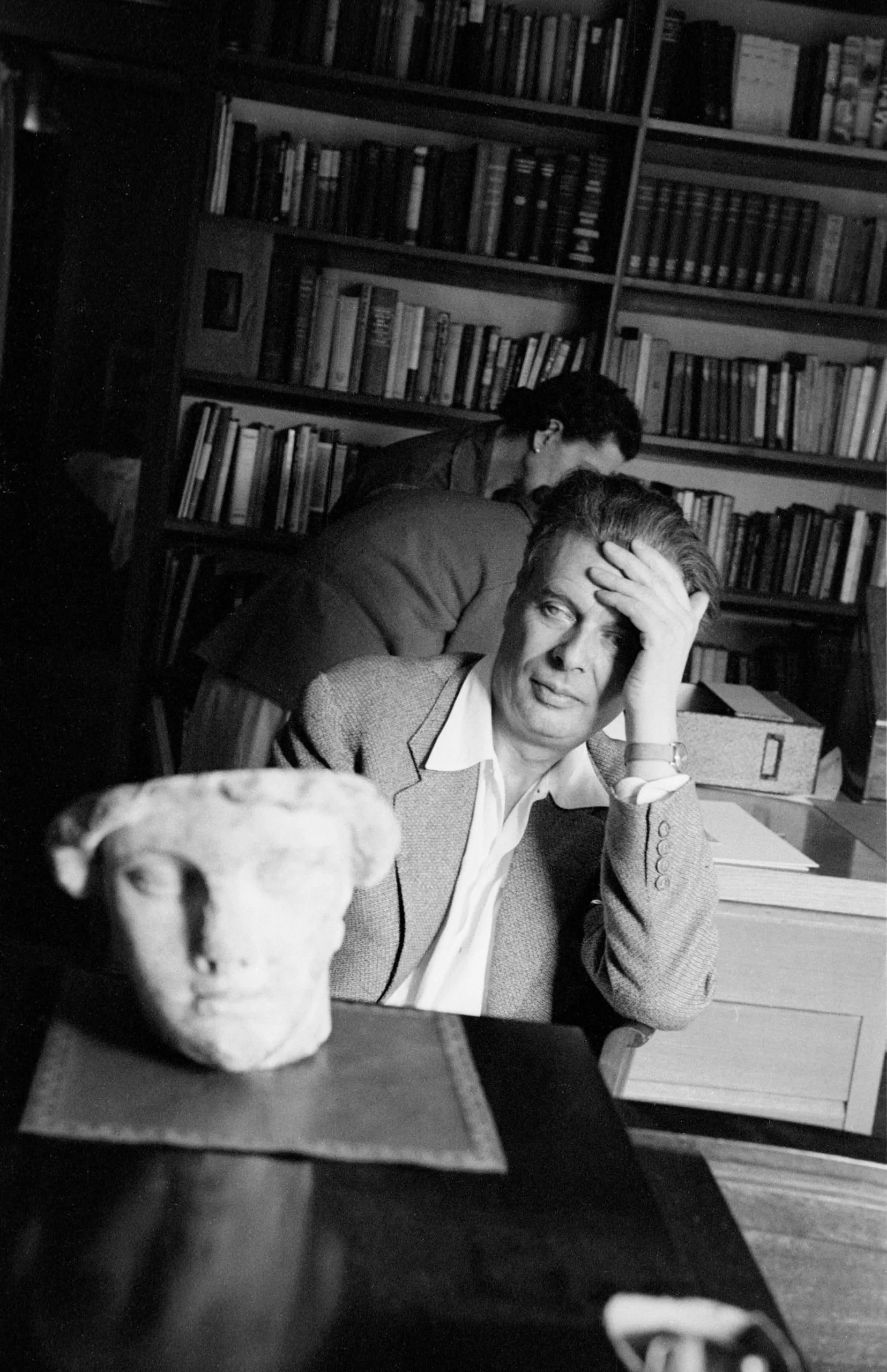 Black and white photograph of a woman at a desk, hand pressed to her forehead, a plaster sculptural head in the foreground and bookshelves behind