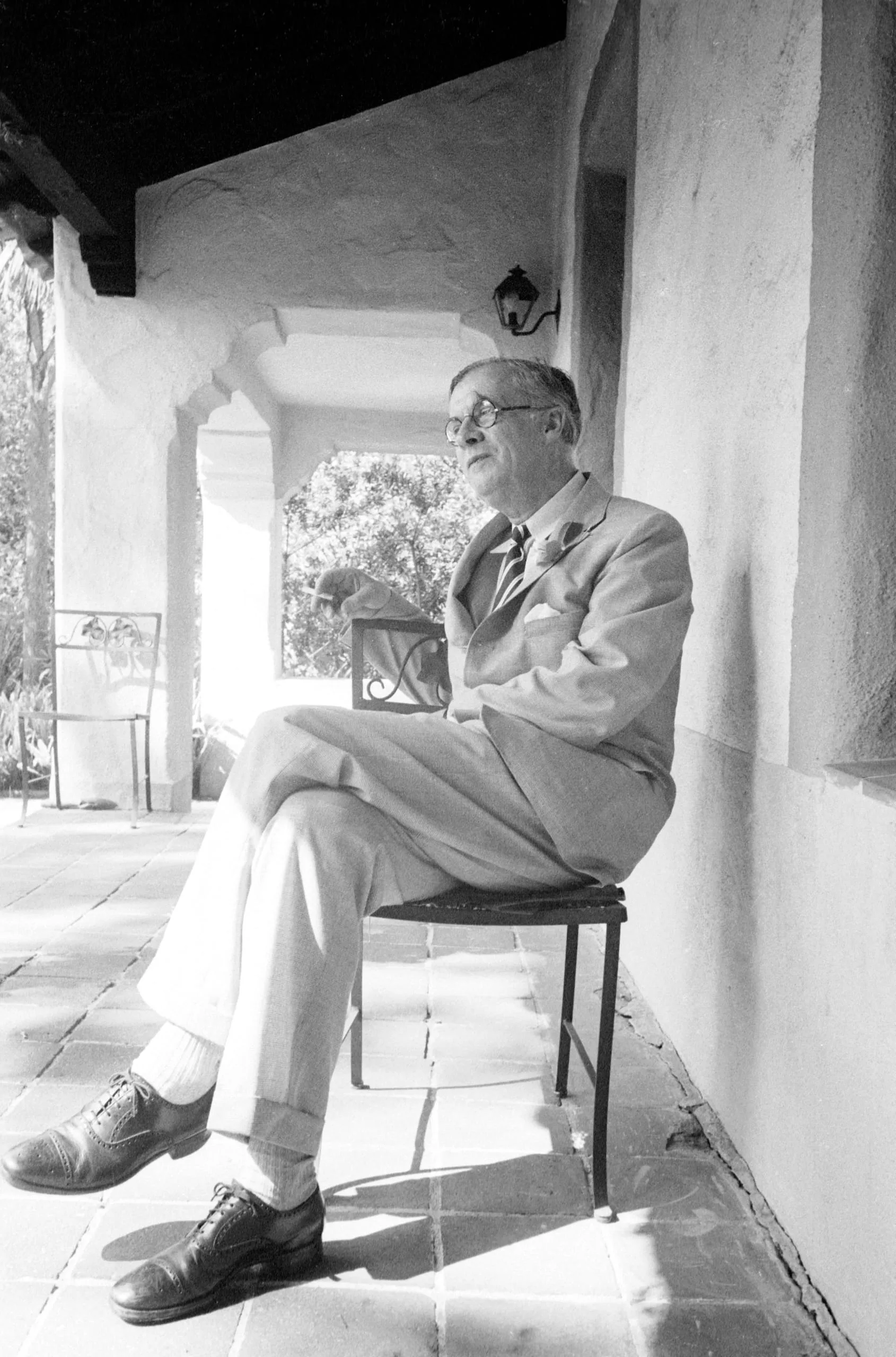 Black and white photograph, full-length portrait of a man in a light suit seated on a metal chair on a stucco-columned porch, legs crossed, looking to one side