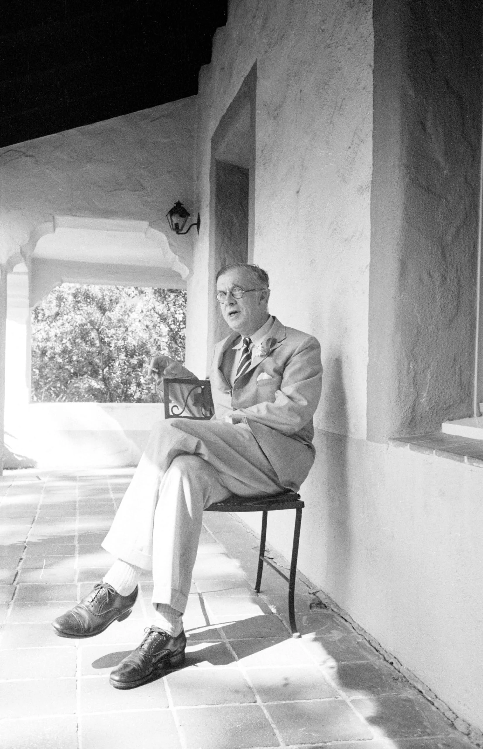 Black and white photograph of a man in a suit seated in a metal chair on a sunlit tiled porch, legs crossed, holding a small framed object