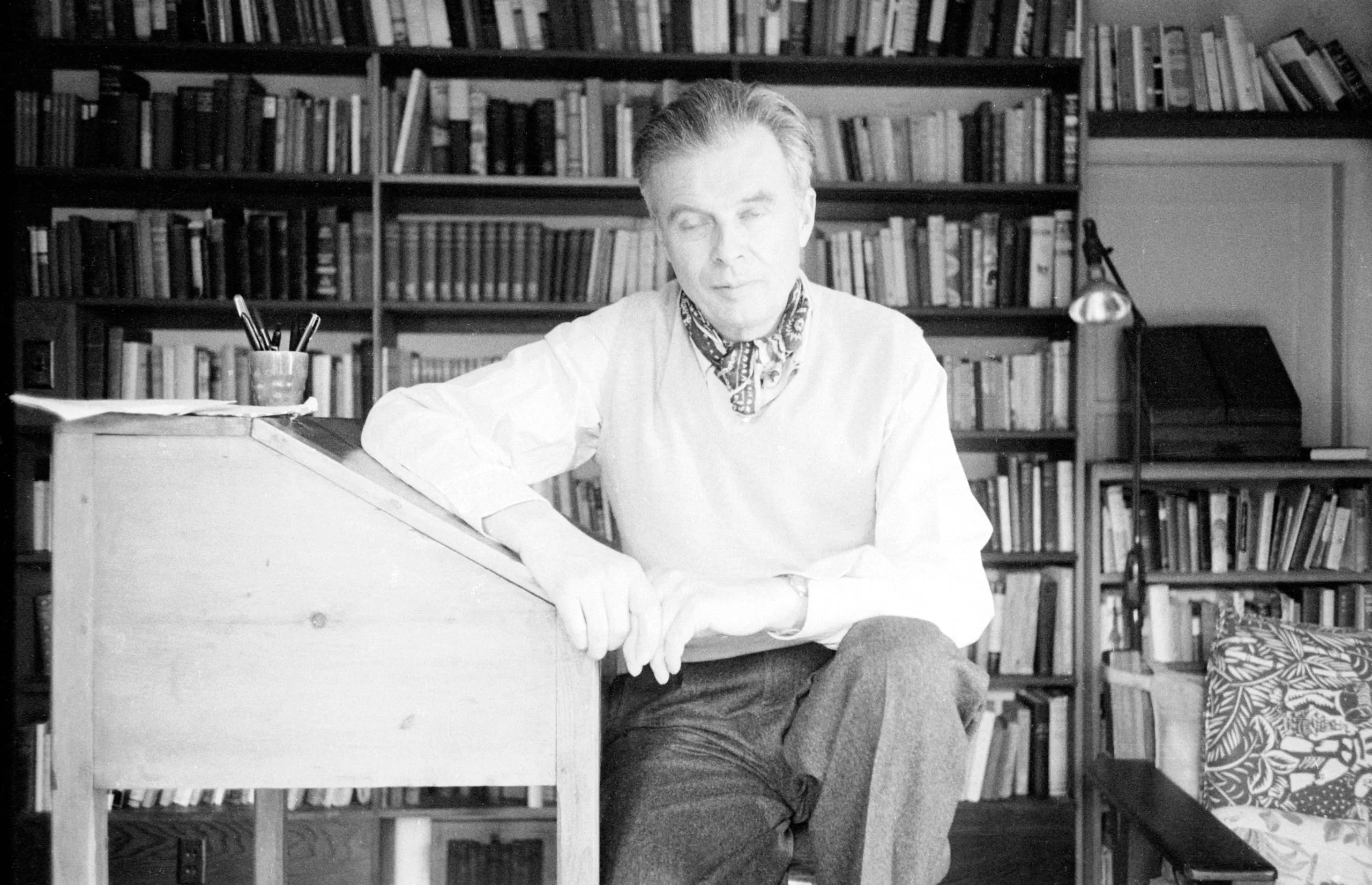 Black and white photograph of a man in a light sweater and patterned neckerchief, seated at a slanted drafting desk in front of floor-to-ceiling bookshelves