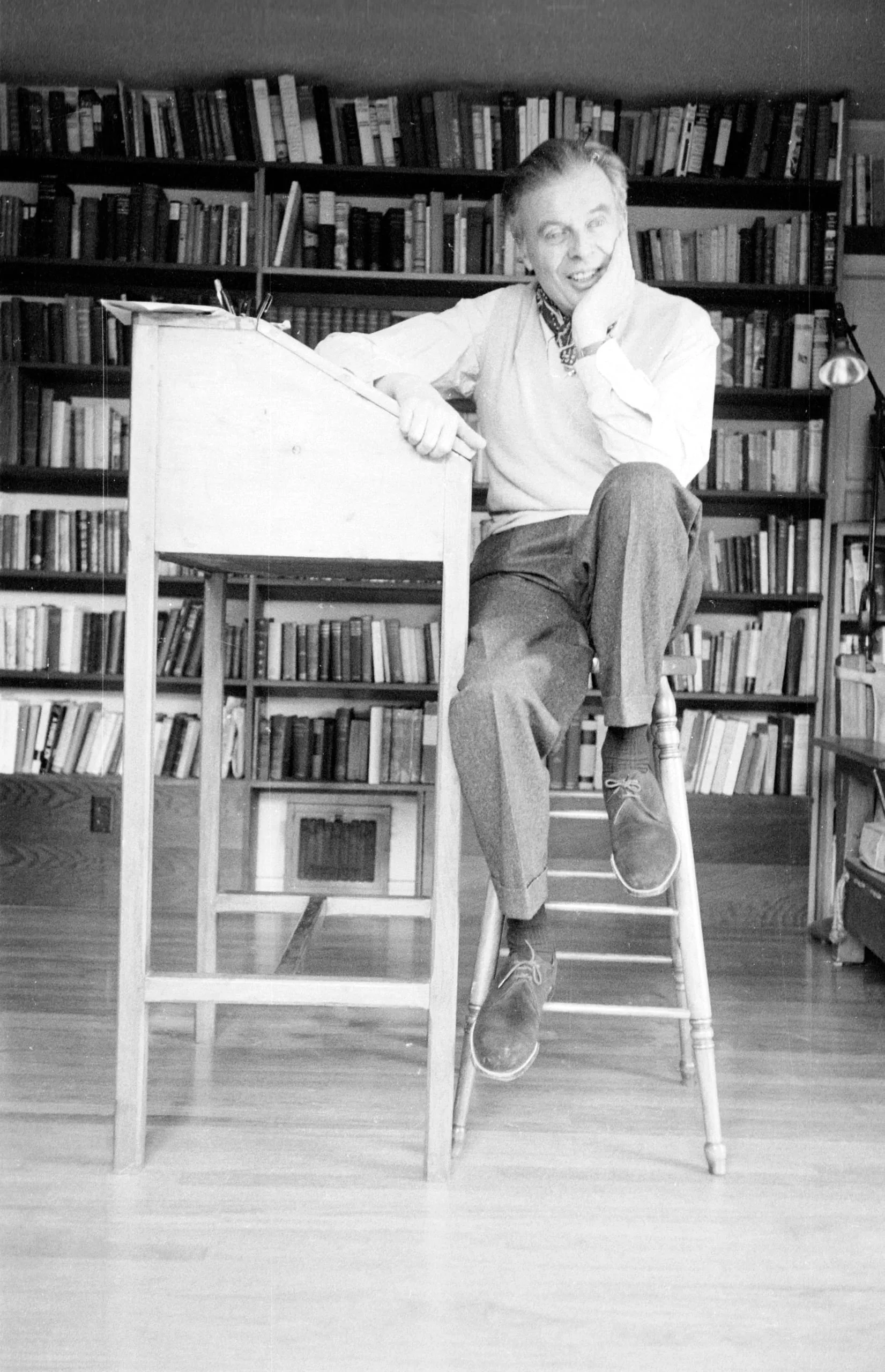 Black and white photograph, full-length portrait of an older white man seated on a tall stool beside a drafting table, grinning broadly, with floor-to-ceiling bookshelves behind him
