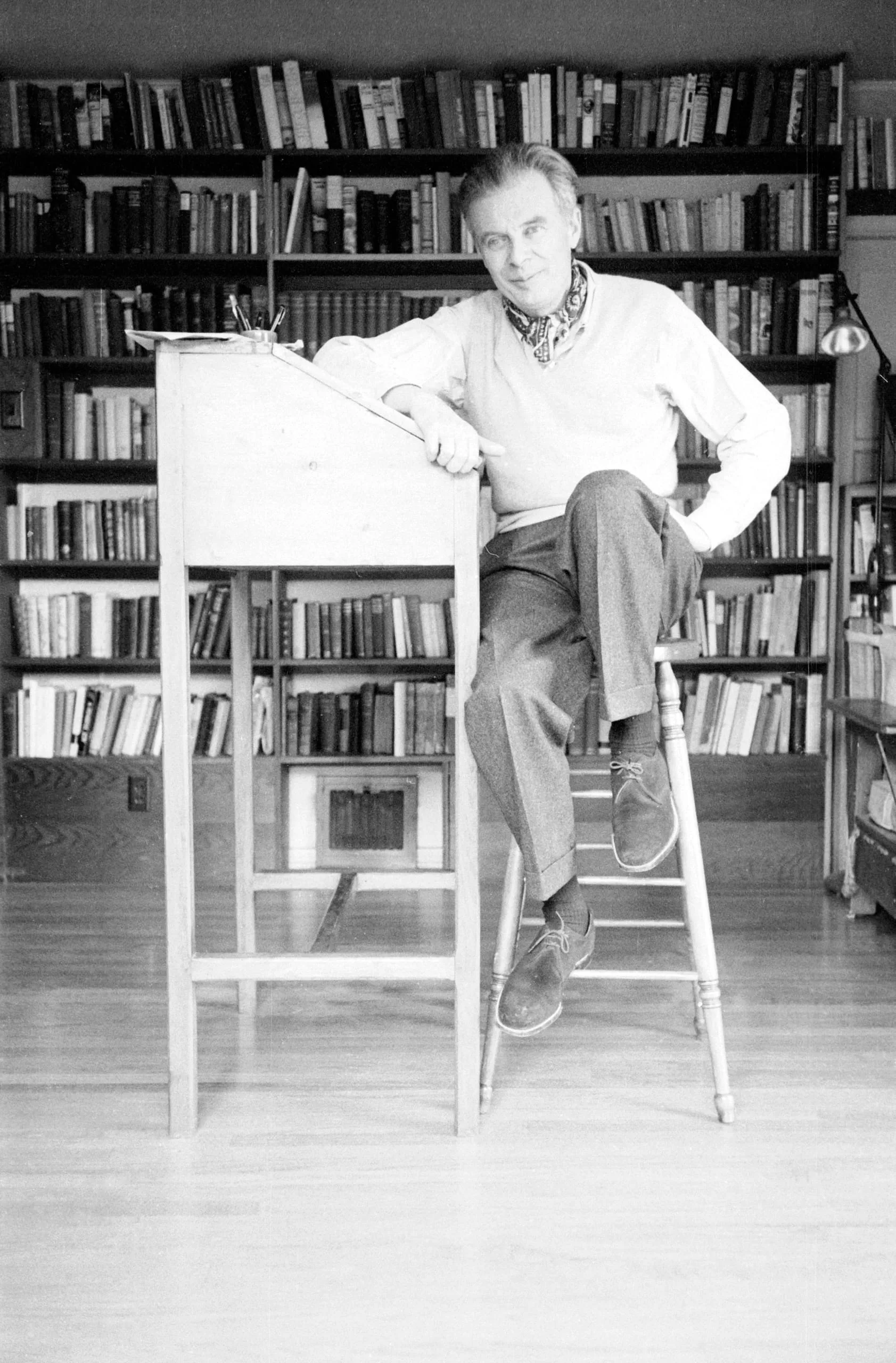 Black and white photograph of a white man with gray hair seated on a tall stool beside a standing desk, bookshelves filling the wall behind him