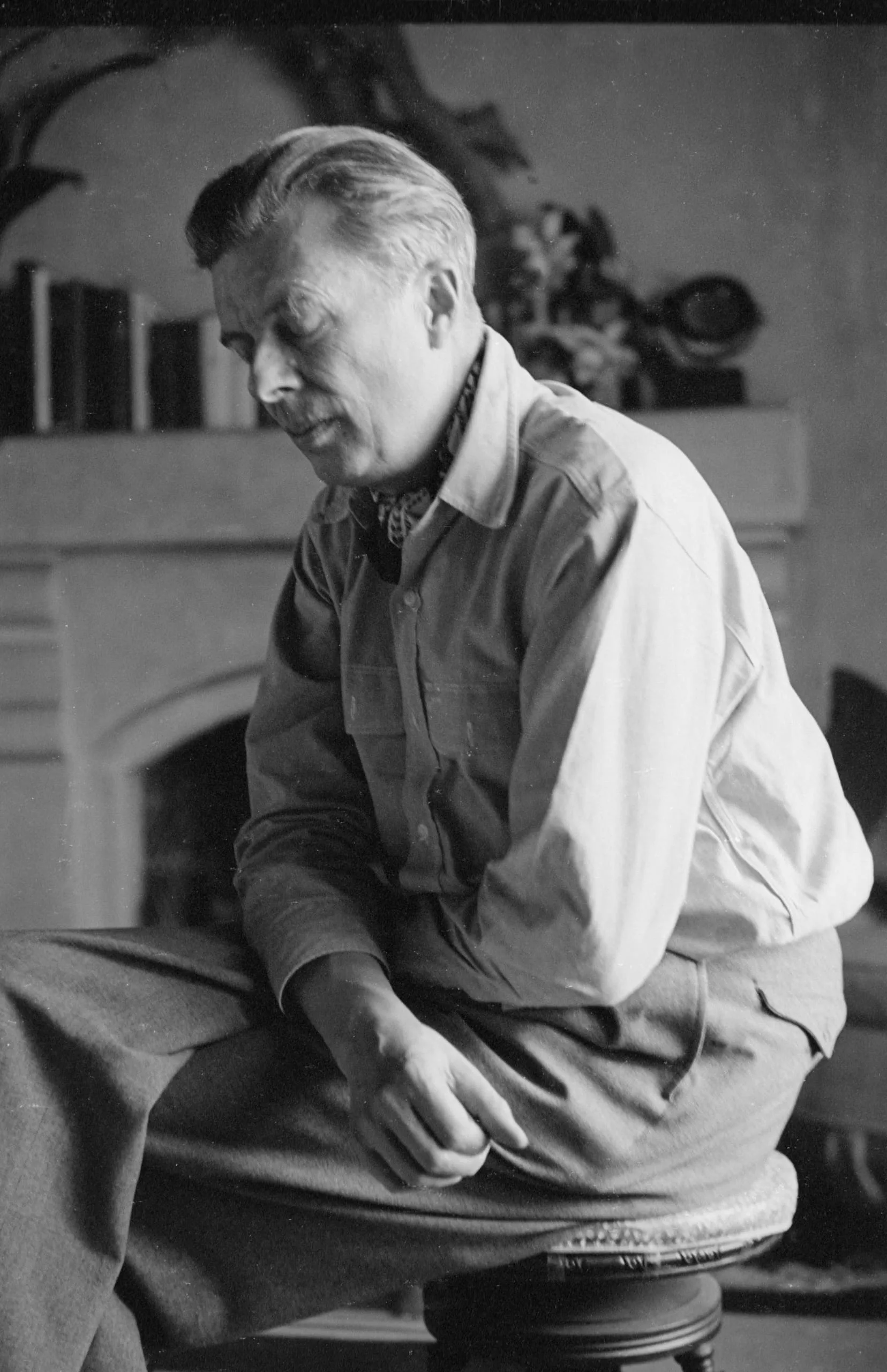 Black and white photograph of a seated man in profile, leaning forward with hands clasped, in a room with a fireplace mantel and books behind him
