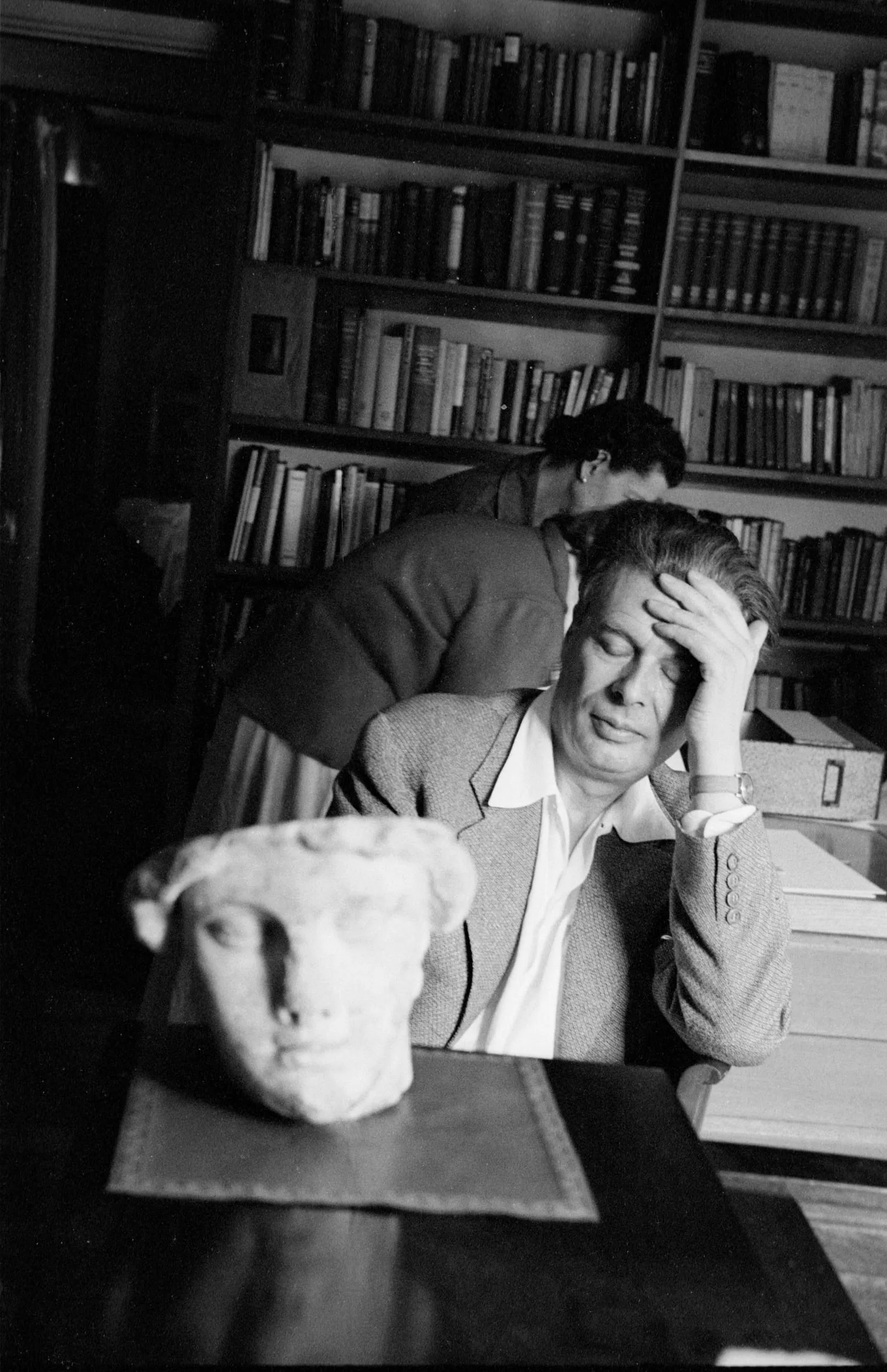 Black and white photograph of a man seated at a desk, hand pressed to his forehead, with a classical sculptural head in the foreground and bookshelves behind