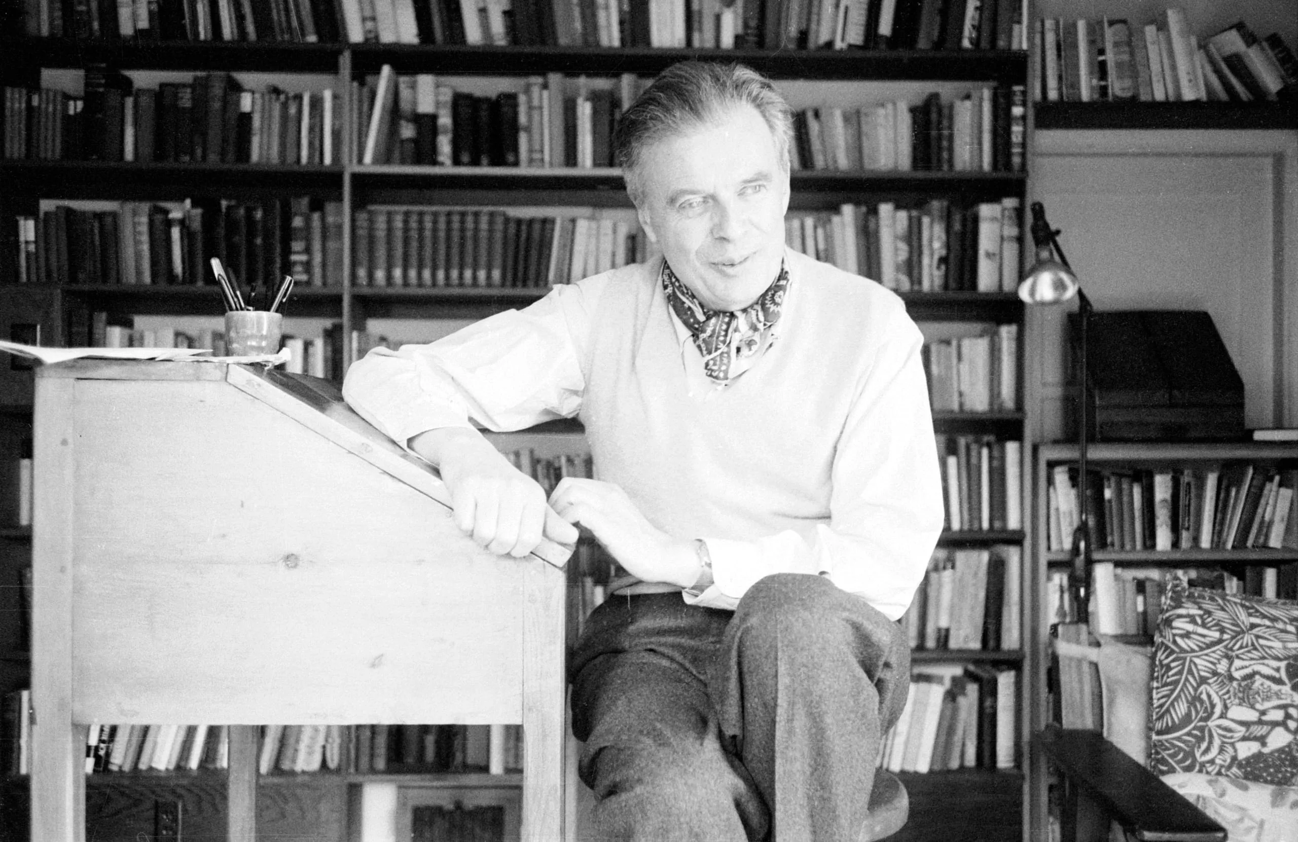 Black and white photograph of a white man with gray hair seated at a wooden drafting table, leaning forward toward the camera, bookshelves filling the background