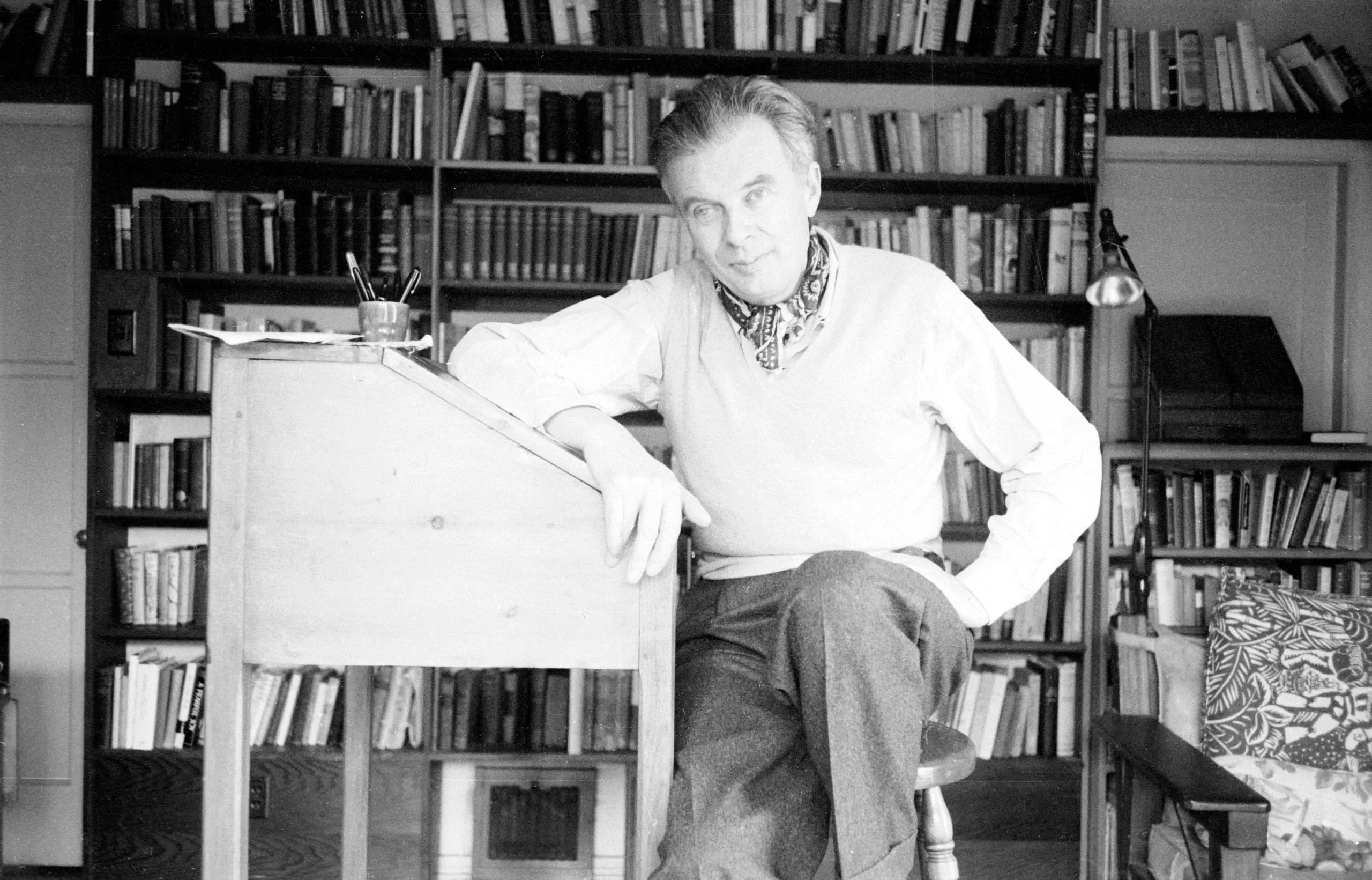 Black and white photograph of a man in a light sweater and paisley neckerchief seated beside a tall drafting desk, bookshelves behind him