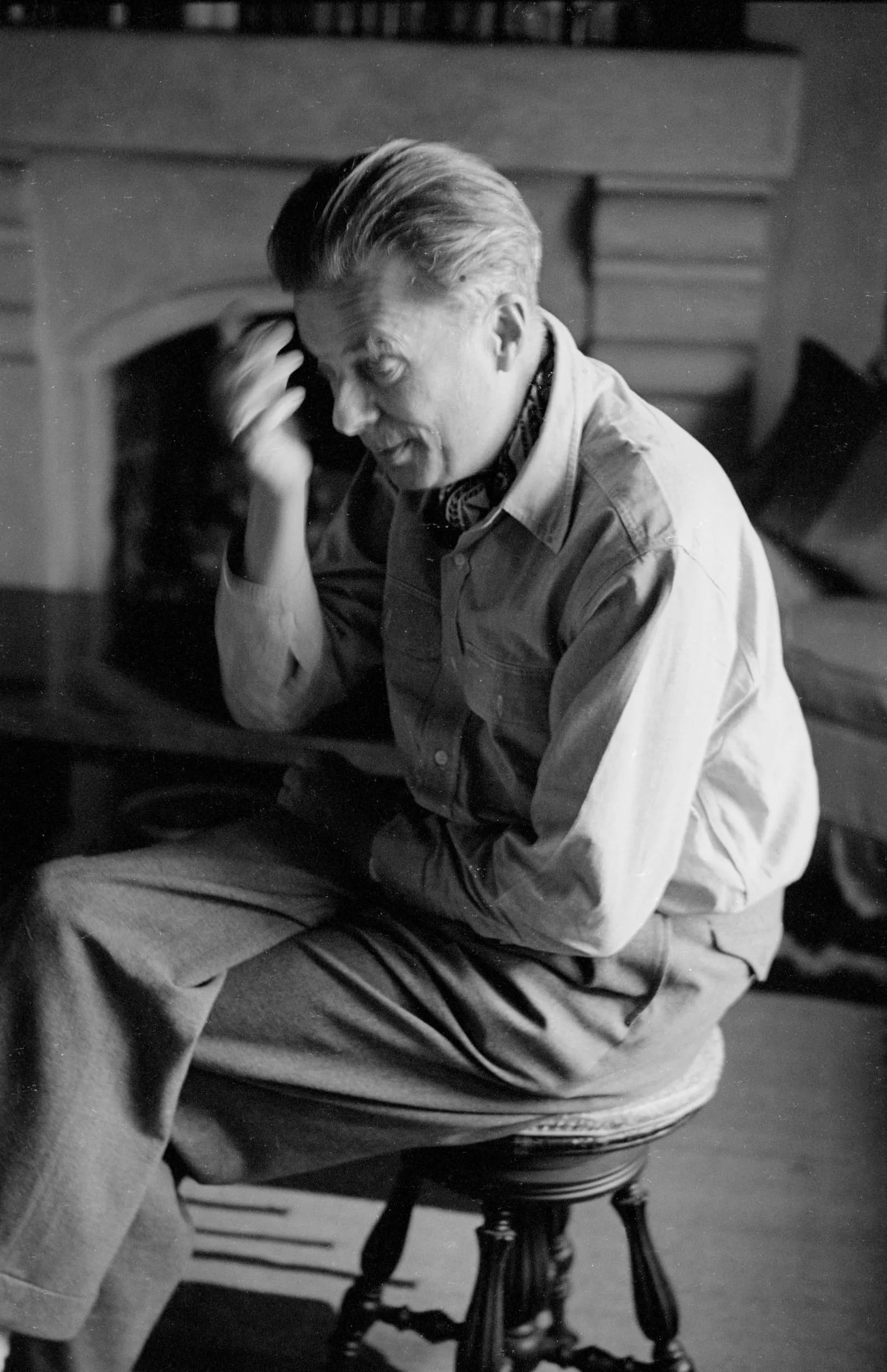 Black and white photograph of a seated man in a collared shirt, head tilted down and hand raised to his temple, a fireplace visible in the distance behind him