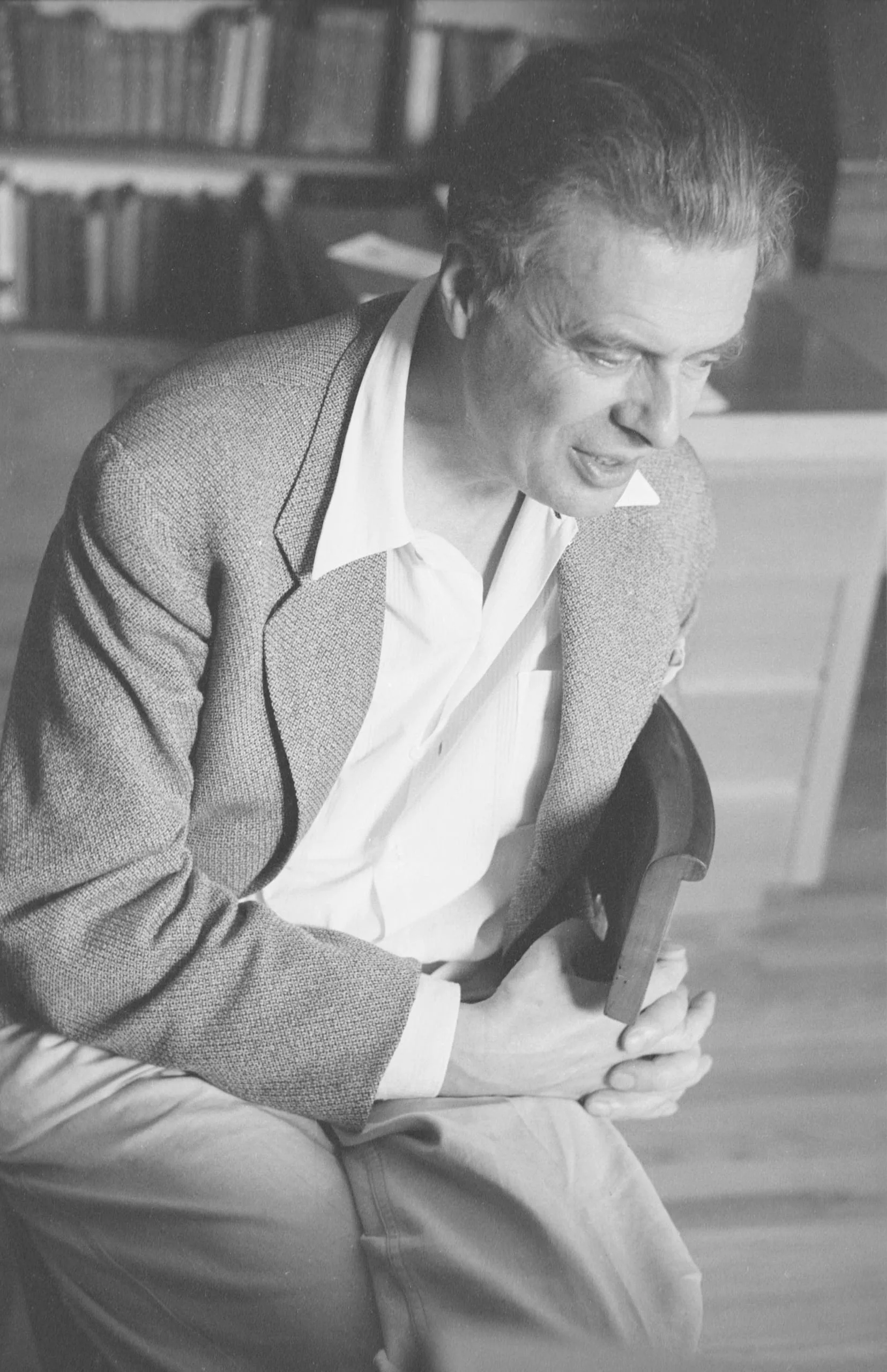 Black and white photograph, a man in a tweed jacket and open-collar shirt seated and leaning forward, hands clasped around a dark hat, bookshelves out of focus behind him