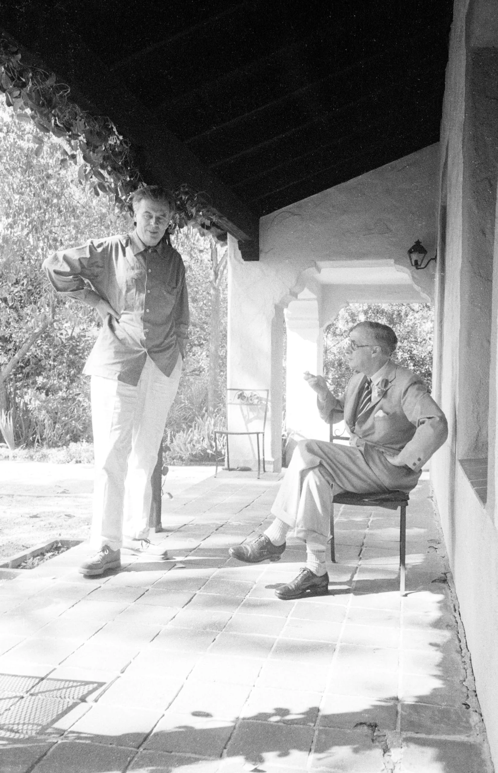 Black and white photograph of two men on a sunlit stucco veranda, one standing mid-gesture in casual dress, one seated in a suit with glasses