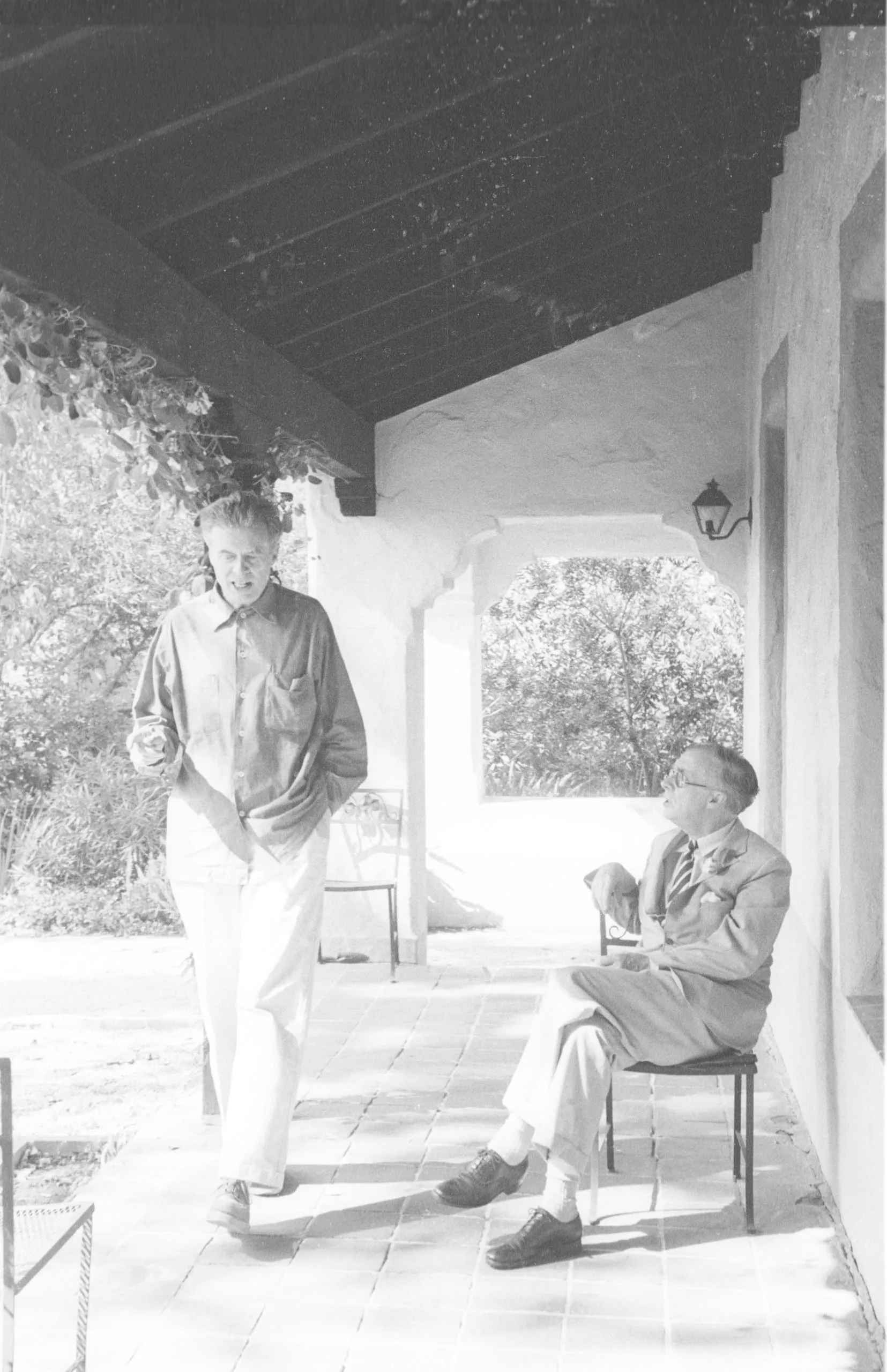 Black and white photograph of two men on a white stucco veranda, one standing in a dark shirt and light trousers, one seated in a suit