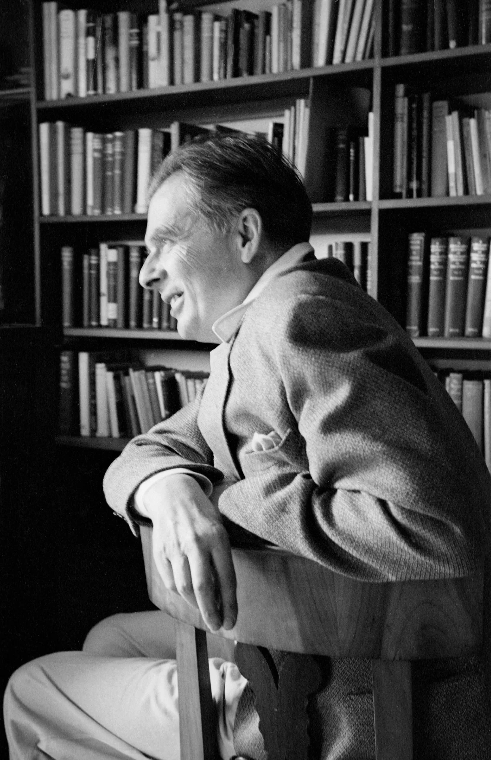 Black and white photograph of a man in a tweed sport coat seated in profile, leaning over a chair back, with bookshelves filling the background