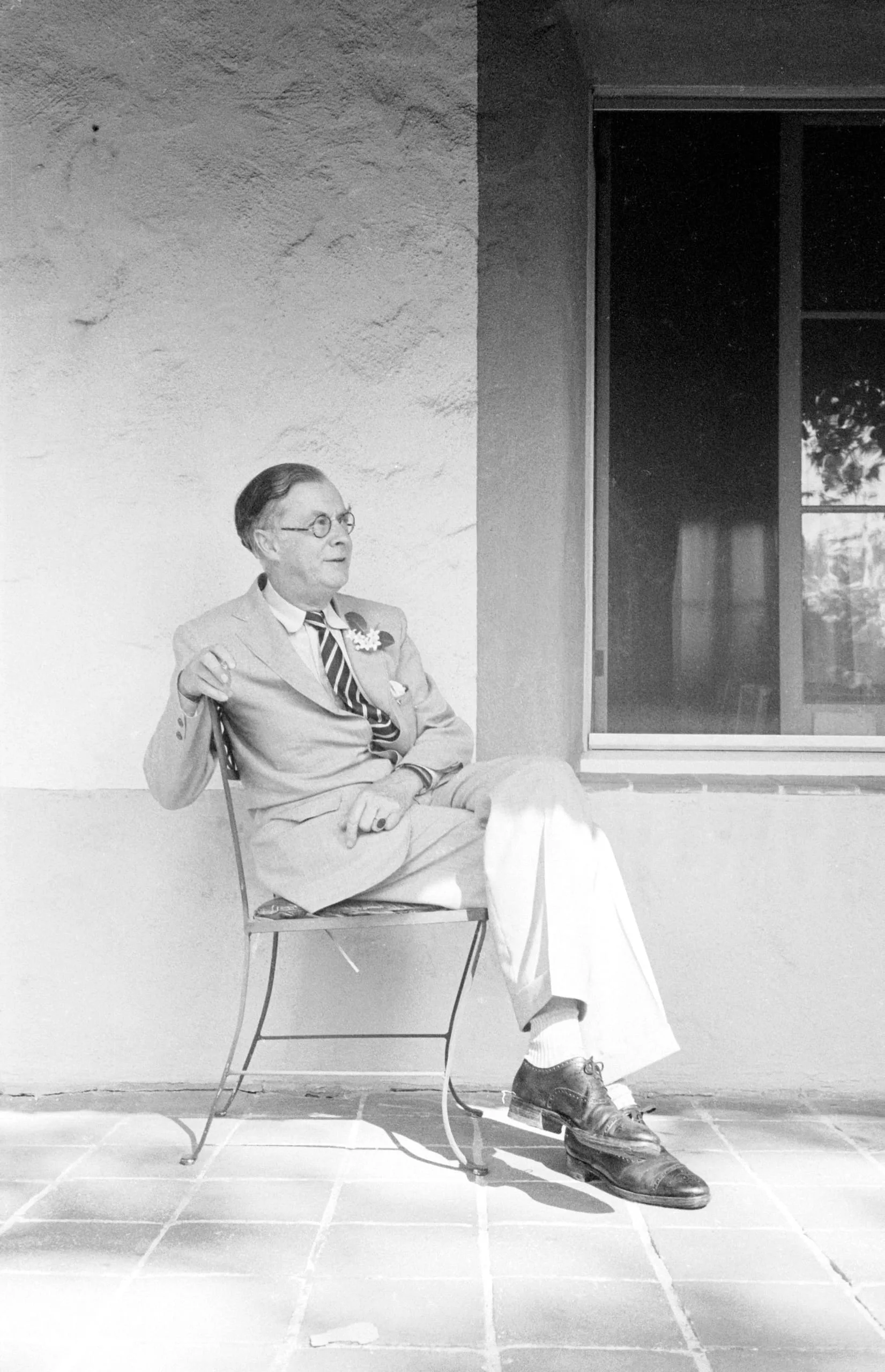 Black and white photograph of a man in a light suit and striped tie seated in a metal folding chair on a tiled patio, legs crossed, head turned to the left