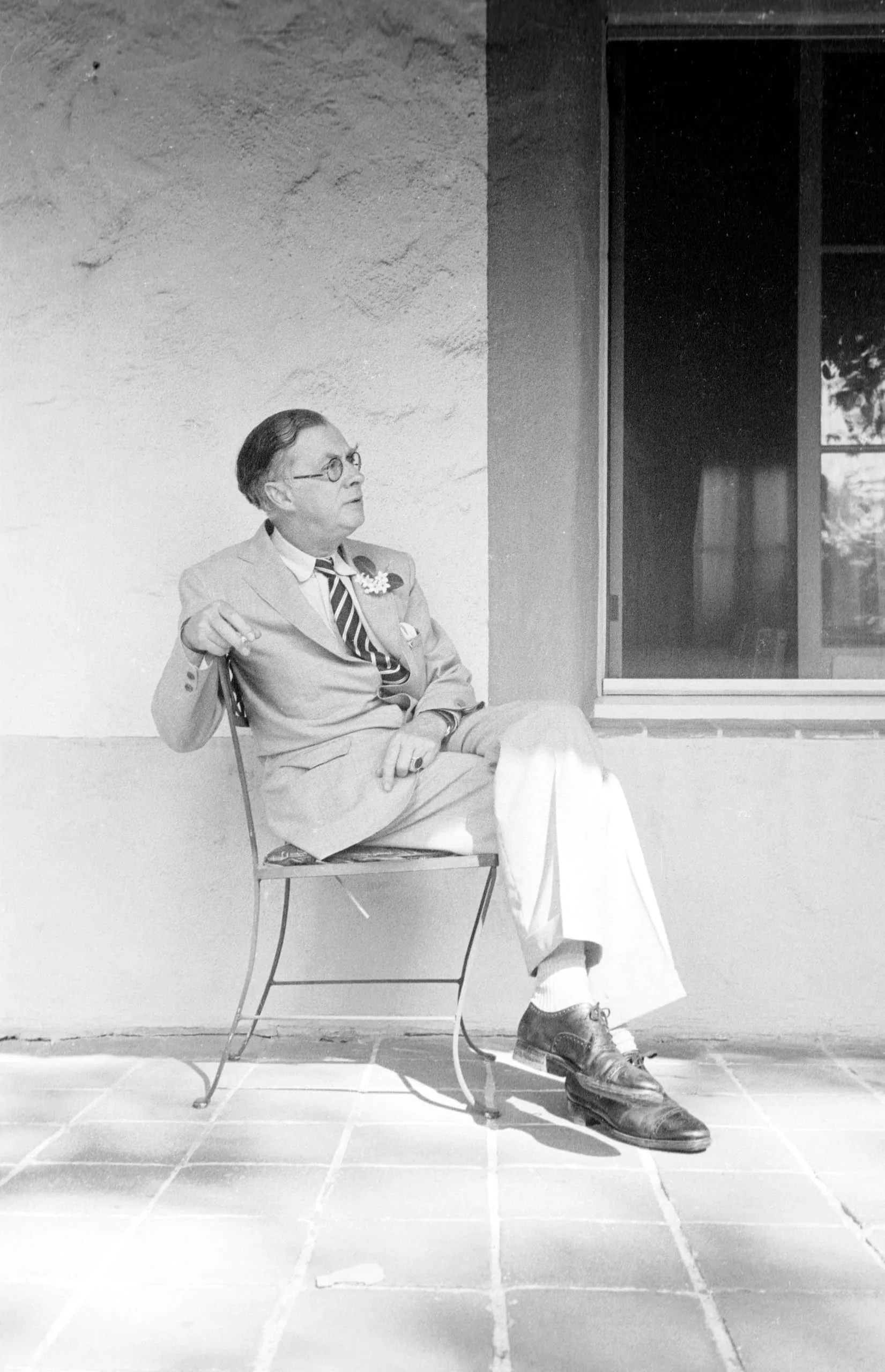 Black and white photograph of a white man in a light suit and striped tie seated in a metal chair on a tiled patio, legs crossed, looking upward