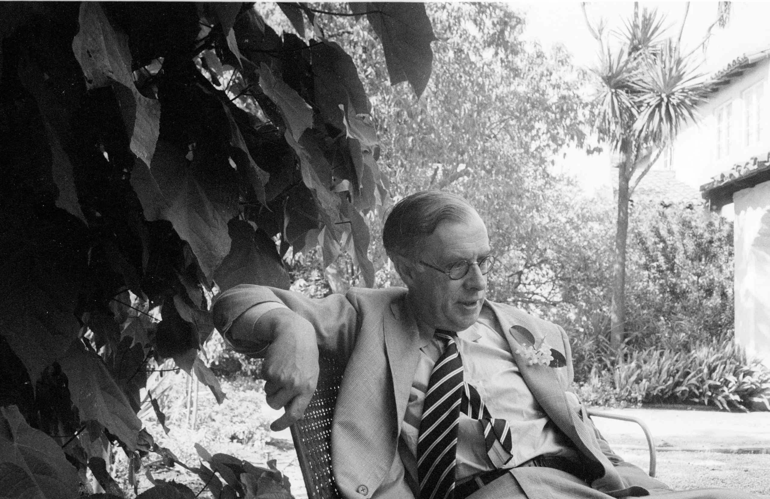Black and white photograph of a man in a suit and striped tie seated in a wicker chair outdoors, large leaves framing the upper left, garden and building visible behind him