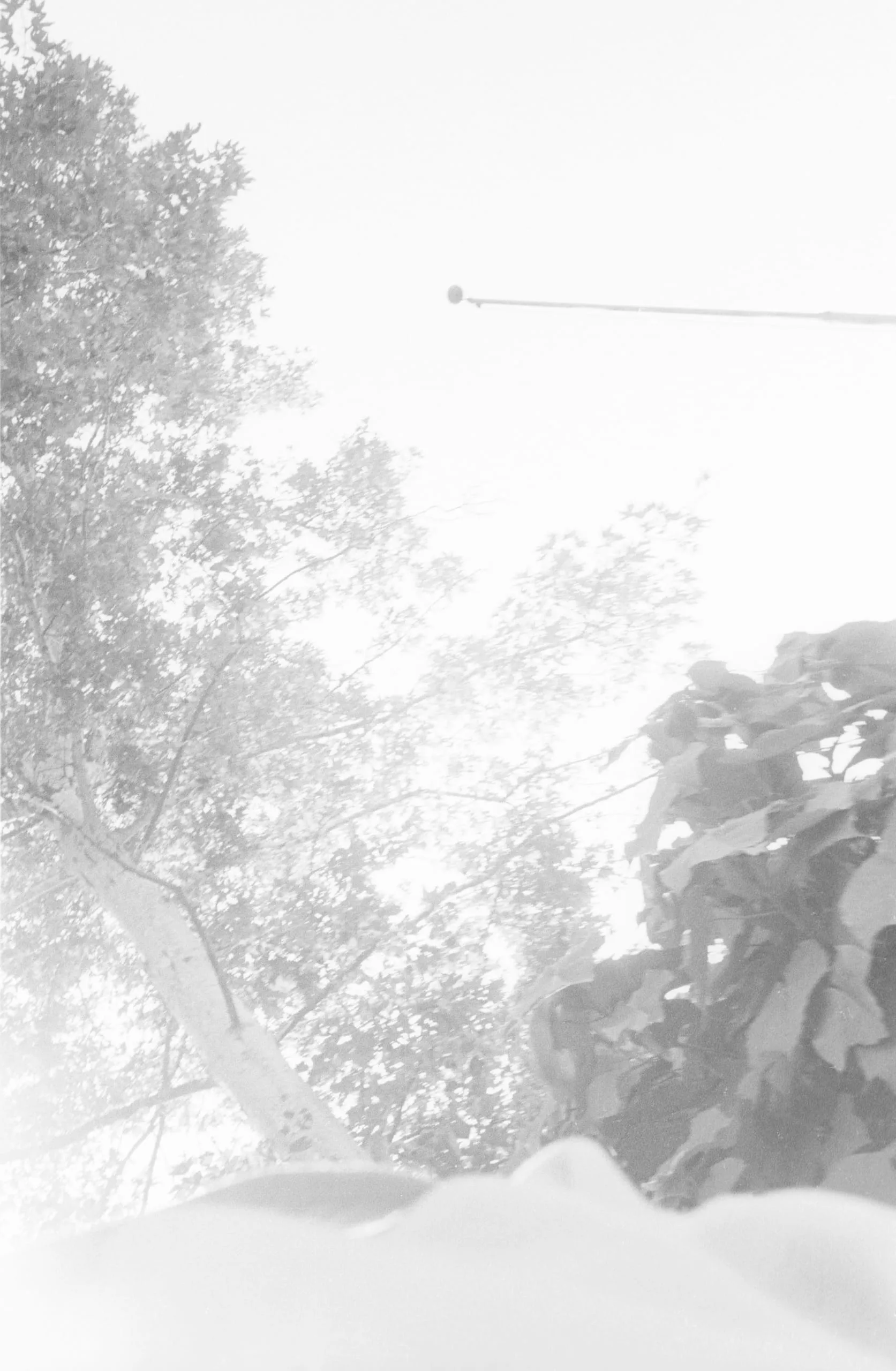 Heavily overexposed black and white photograph, low-angle view looking up through snow-covered ground toward tree branches and a wire against a white sky