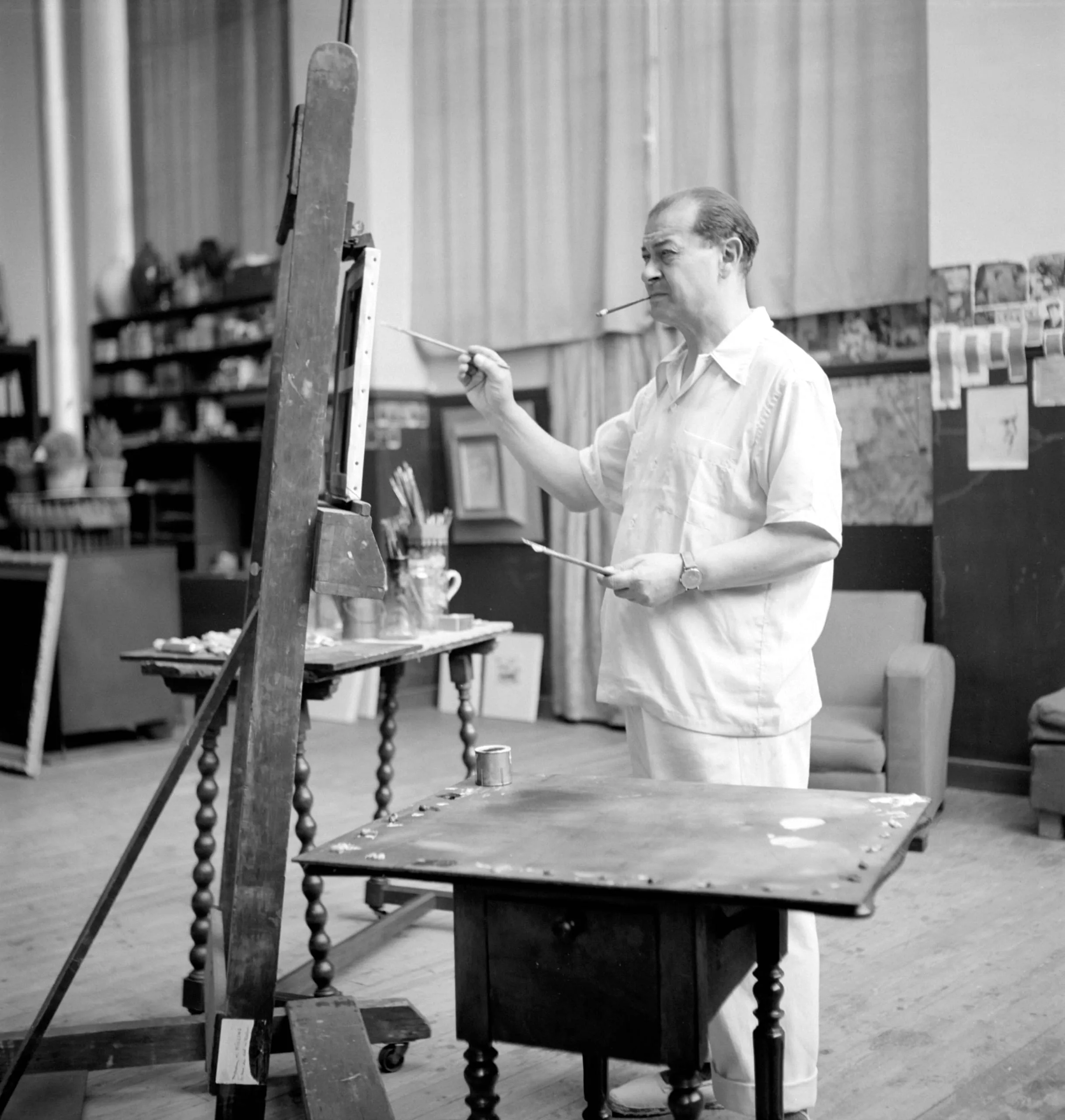 Black and white photograph of a man in a short-sleeved shirt painting at a large wooden easel in an artist's studio, holding two brushes