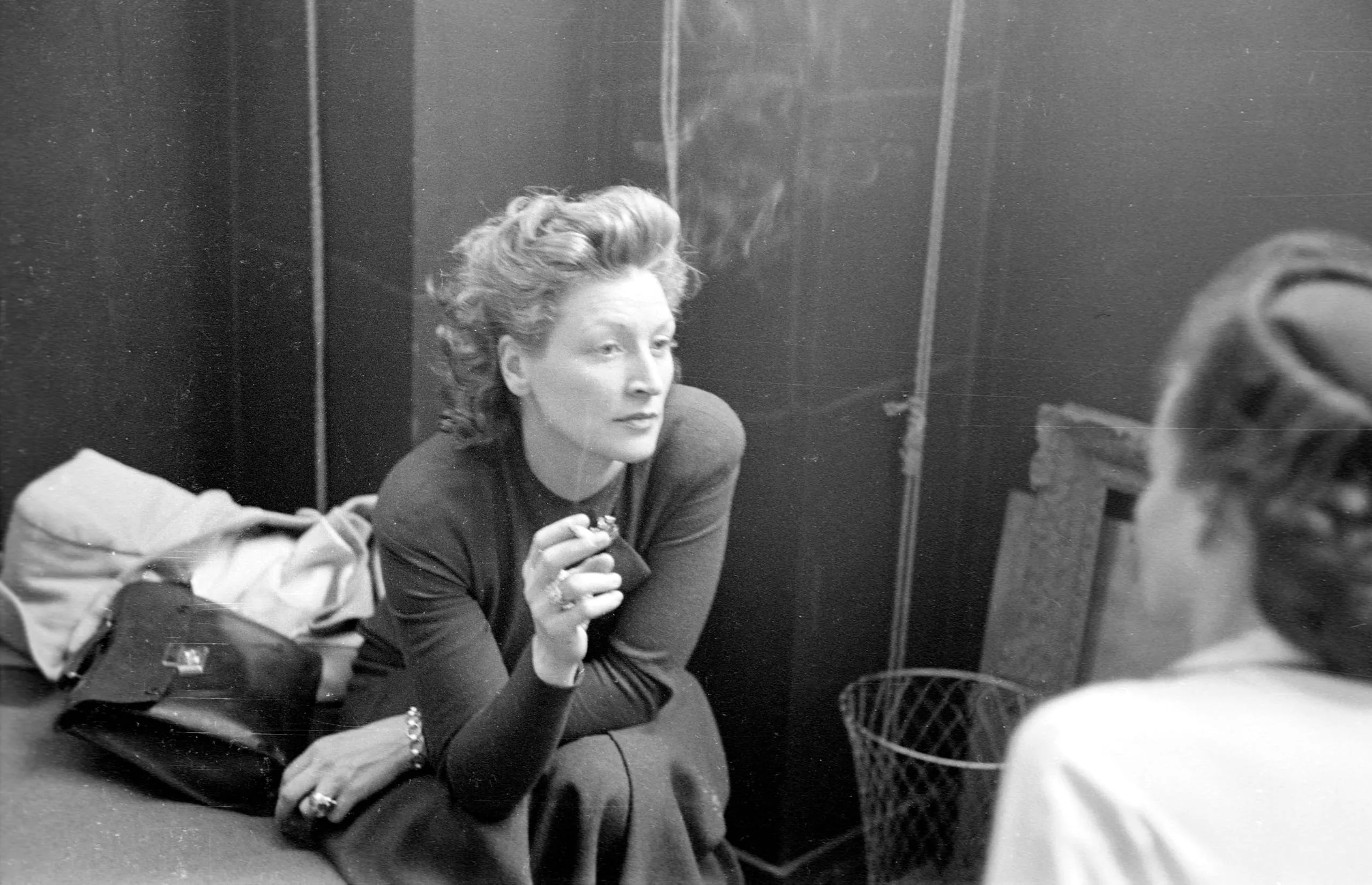 Black and white photograph of a white woman seated and smoking a cigarette, body angled right, wearing a dark long-sleeved dress, with a handbag beside her and a second figure partially visible at lower right