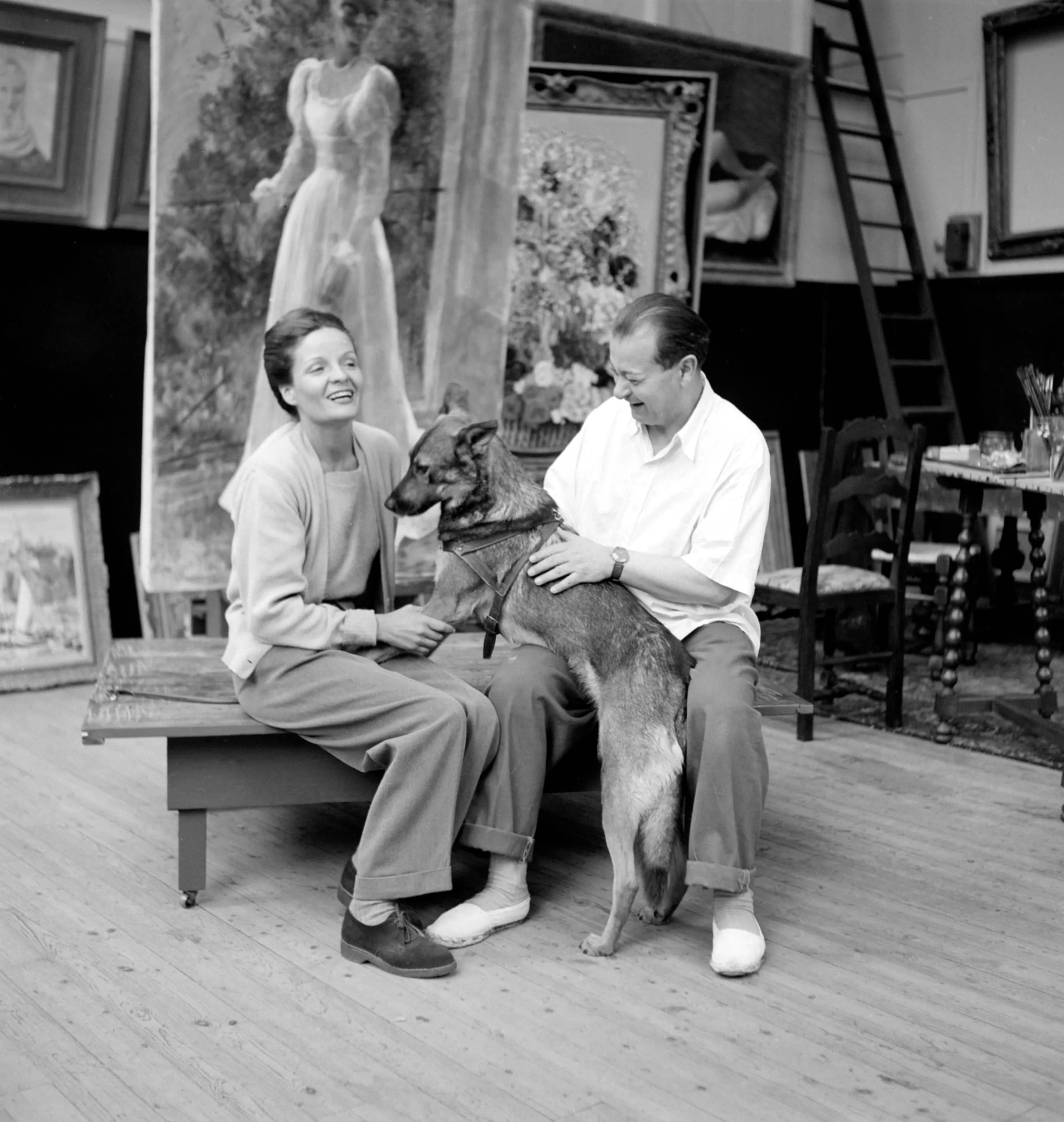 Black and white photograph of a man and woman seated on a bench in an art studio, petting a German Shepherd, surrounded by large paintings