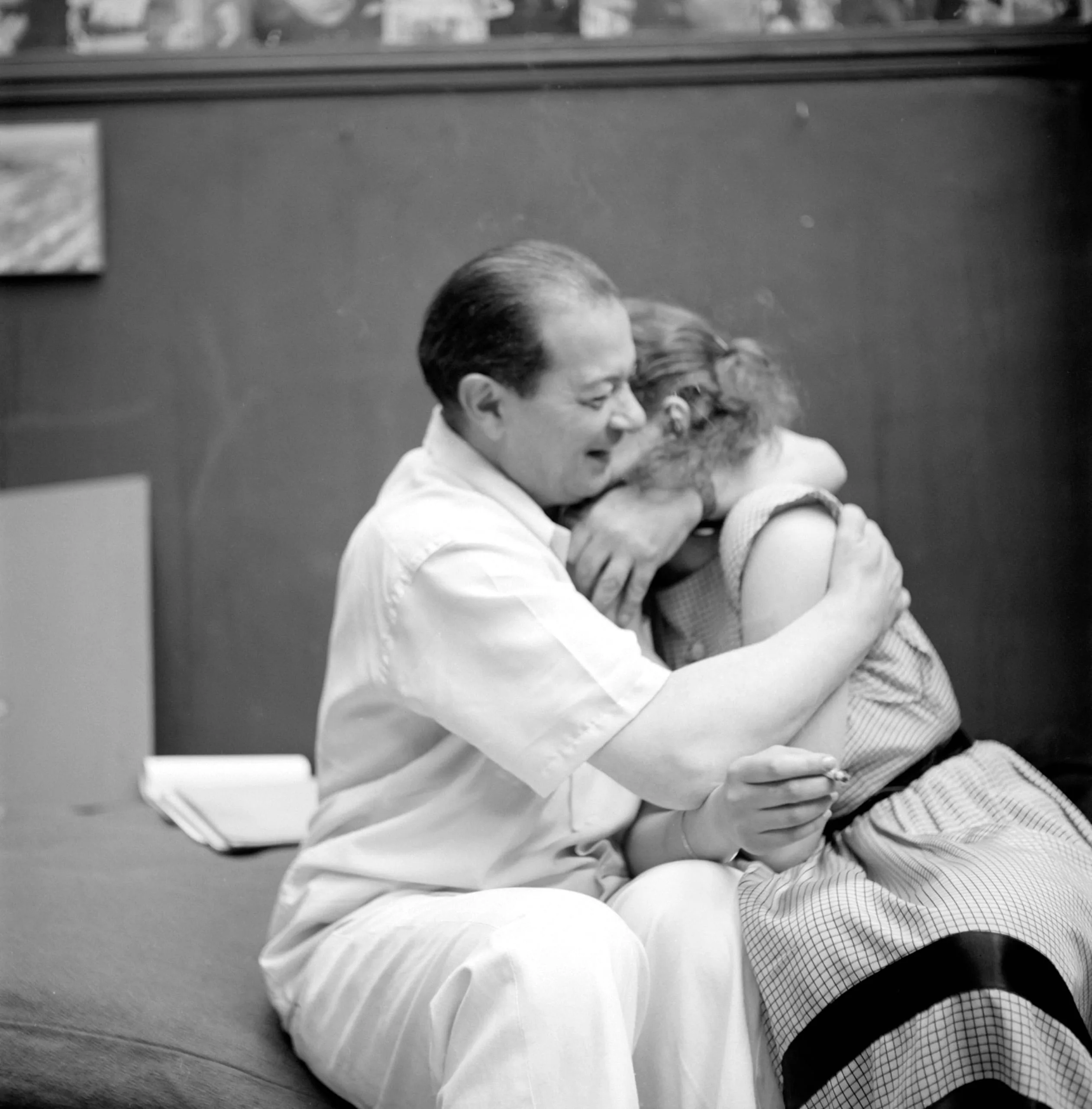 Black and white photograph of a man in white shirt and trousers embracing a young curly-haired girl in a plaid dress, both seated close together indoors