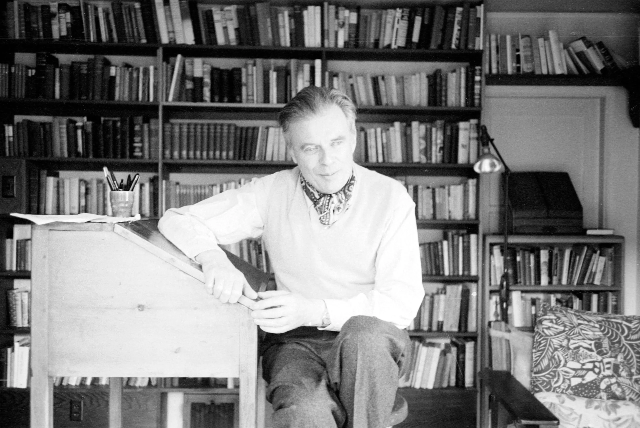 Black and white photograph of a man in a V-neck sweater and patterned scarf seated at a tilted drafting desk, surrounded by floor-to-ceiling bookshelves