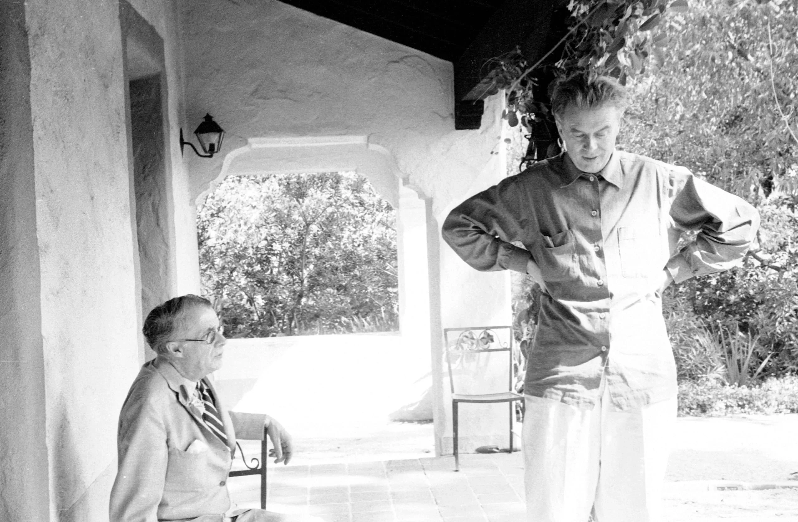Black and white photograph, two men on a stucco porch — one seated in a wrought-iron chair, one standing with hands on hips, leafy garden behind