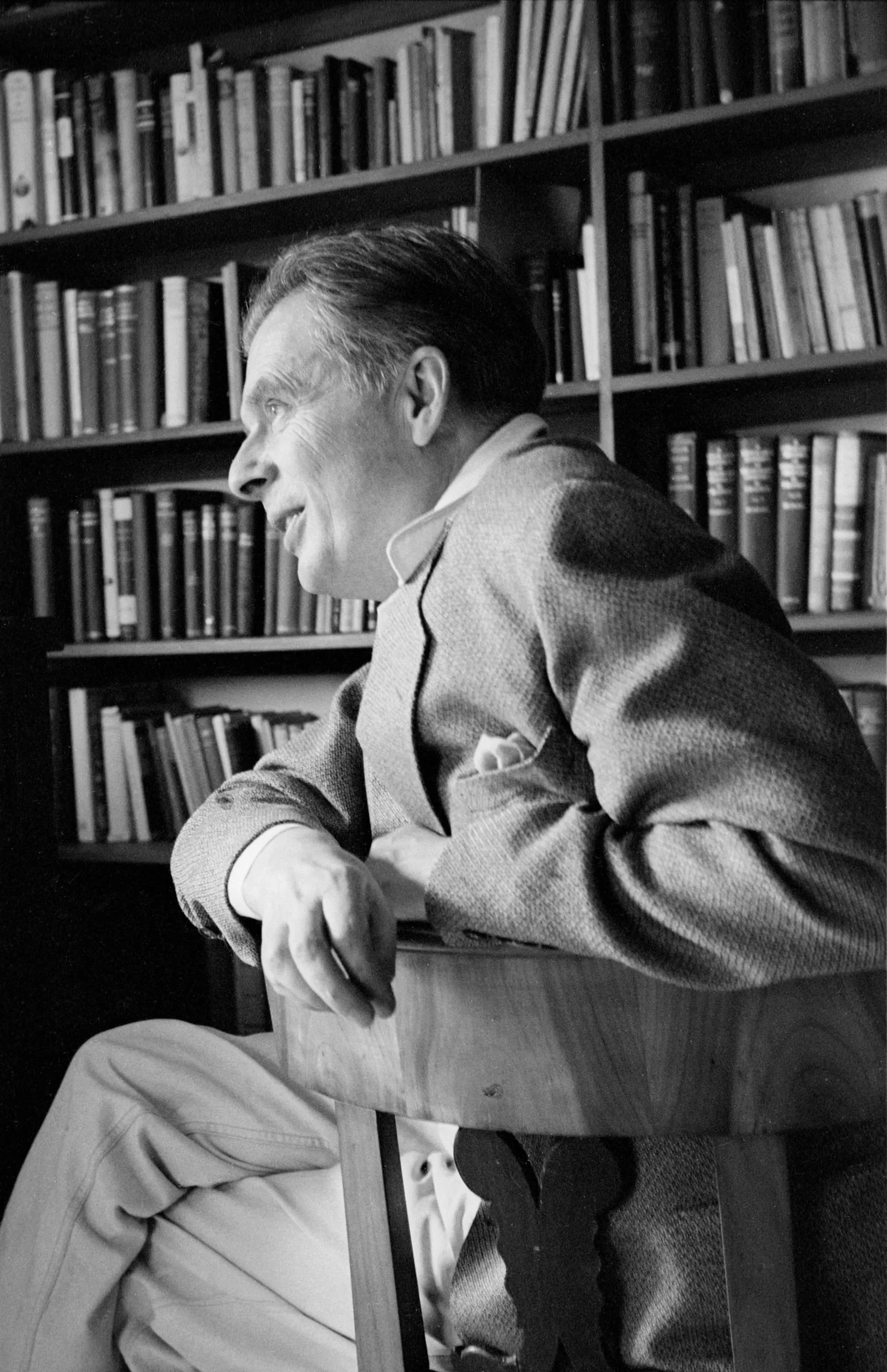 Black and white photograph of a white man in a tweed jacket seated in profile in a wooden chair, leaning forward, with bookshelves behind him