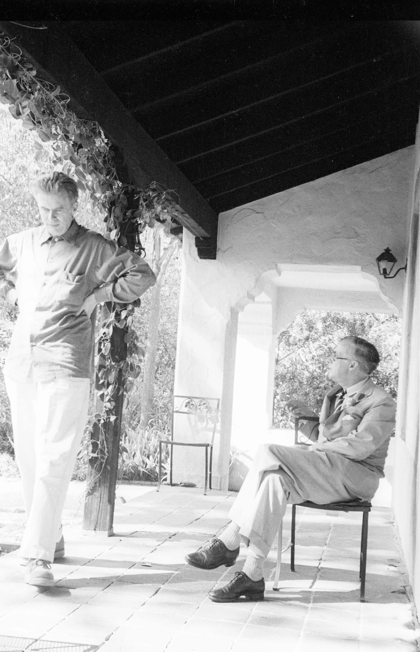 Black and white photograph of two men on a shaded stucco porch, one standing with arms crossed, one seated in a suit with legs crossed