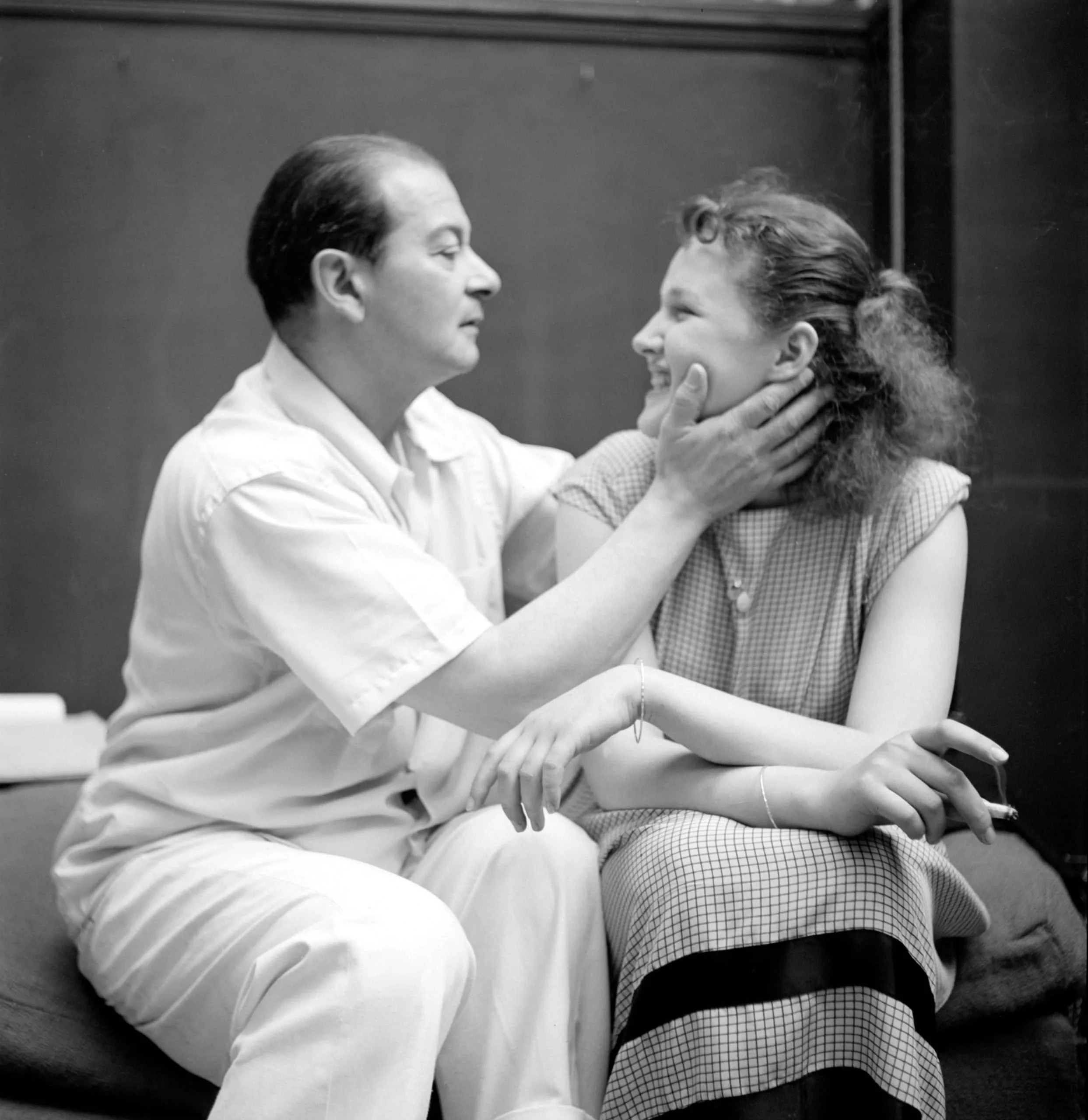 Black and white photograph of a man in white shirt and trousers cupping a smiling woman's face as they sit together on a dark bench