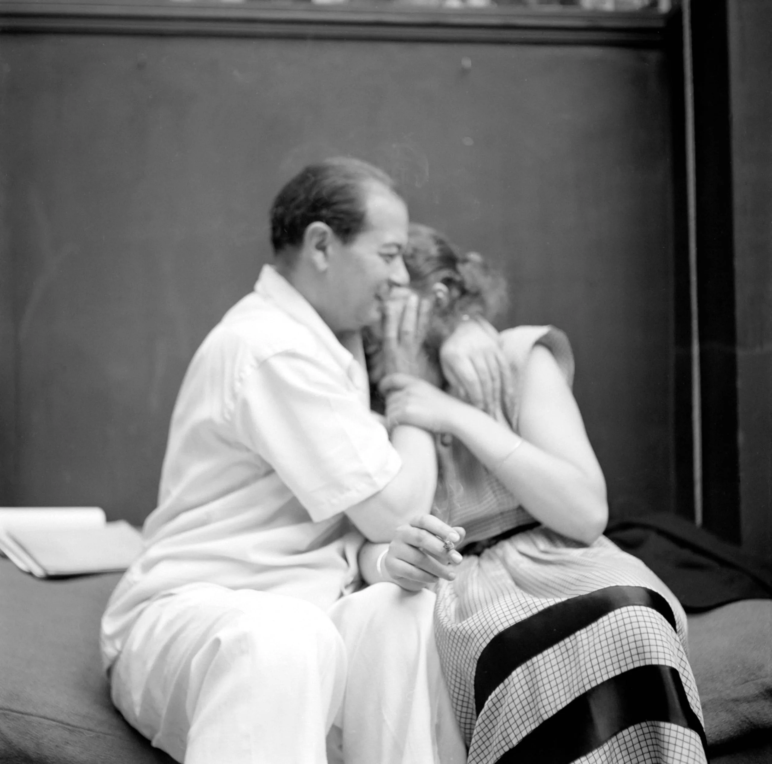 Black and white photograph of a man and woman seated close together on a bench, the man leaning in toward the woman whose face is turned downward