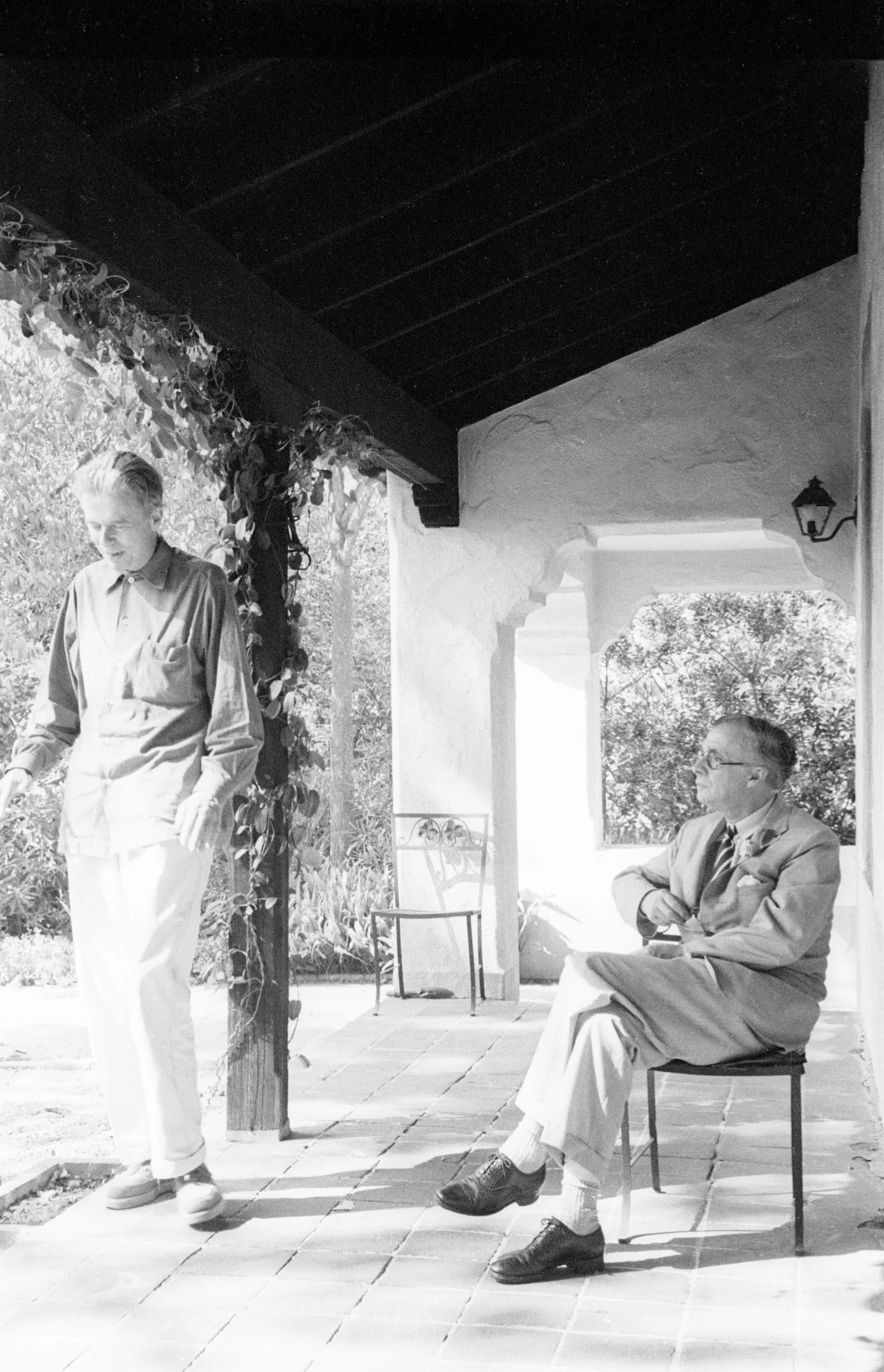 Black and white photograph of two men on a shaded stucco veranda, one standing near a vine-covered column, one seated in a metal chair holding papers