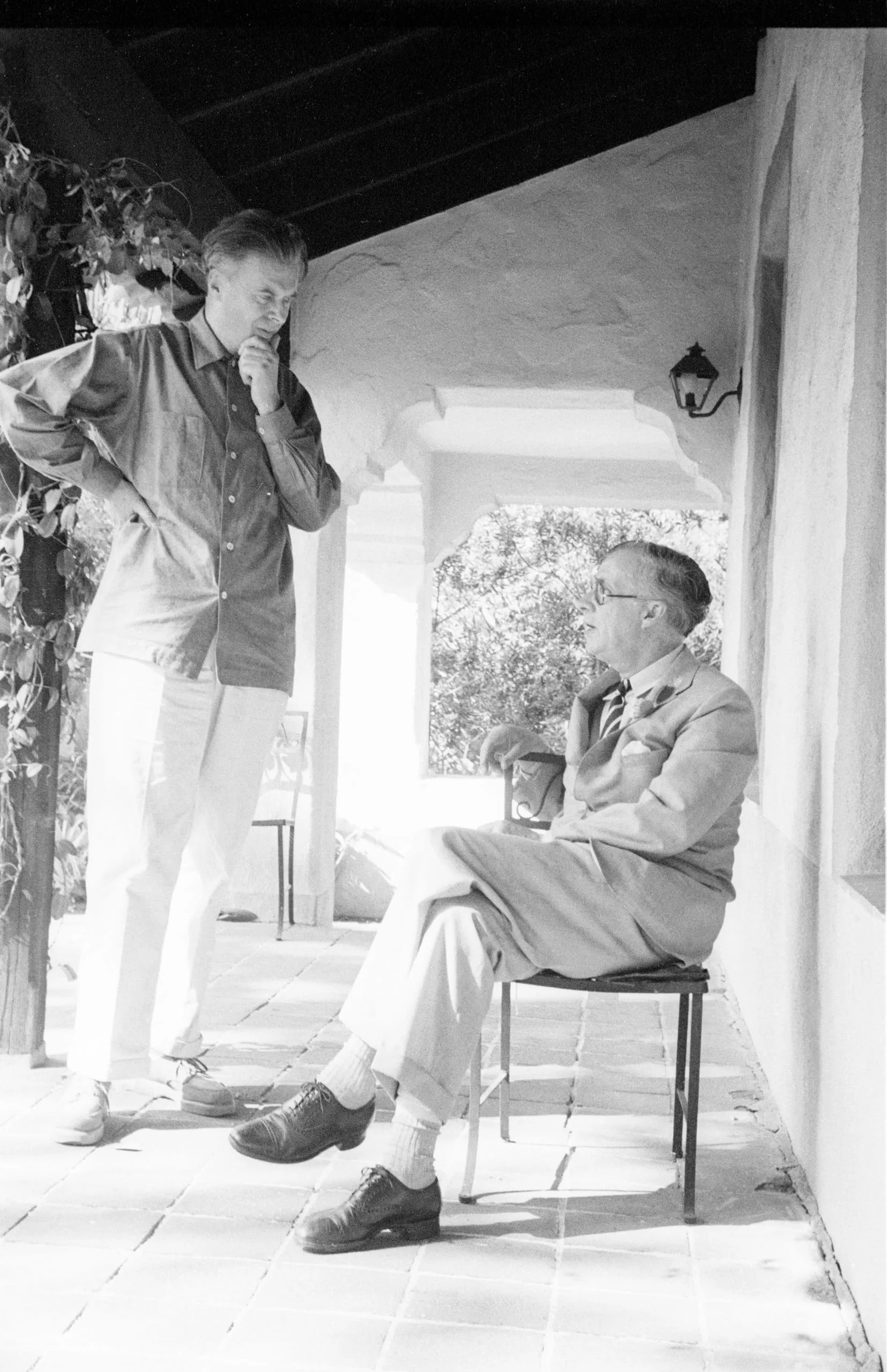 Black and white photograph of two white men on a stucco-walled porch, one standing in casual shirt and trousers, one seated in a suit and glasses, both with hands raised near their chins