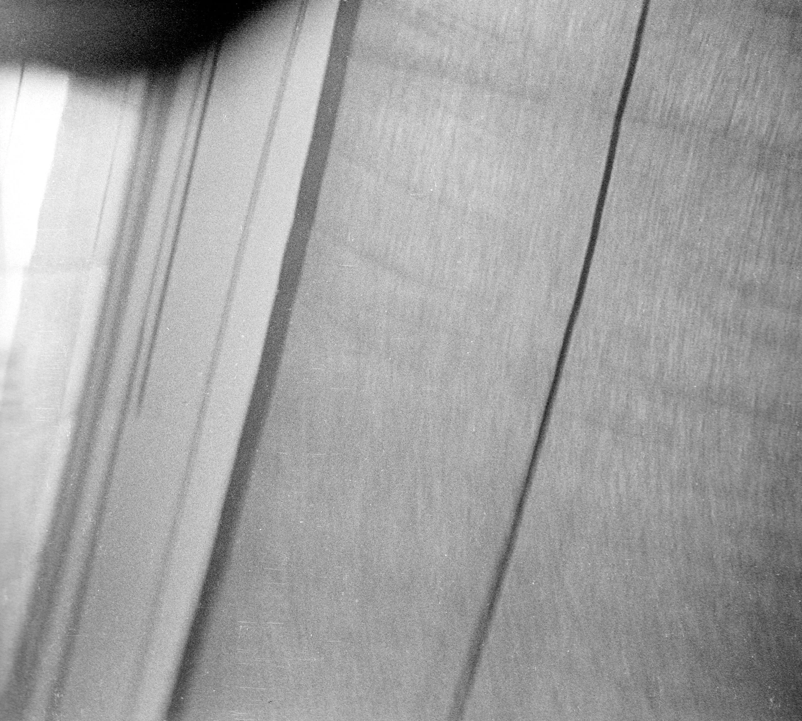 Black and white photograph of a diagonal wood-grain surface with a narrow molded strip dividing two angled planes, soft diffused lighting