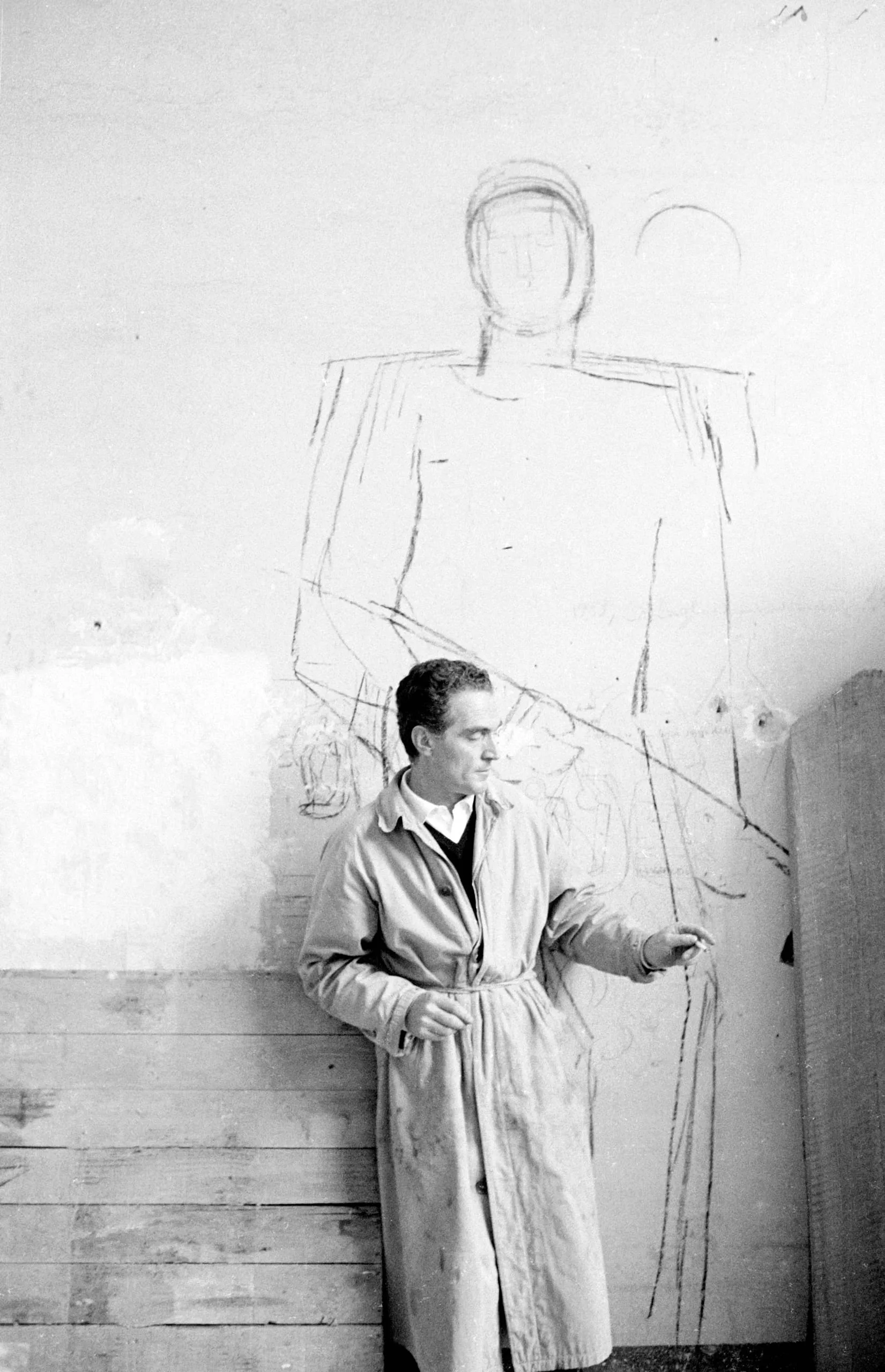 Black and white photograph of a man in a belted trench coat standing before a whitewashed wall, holding a drawing implement beside a large chalk sketch of a human figure