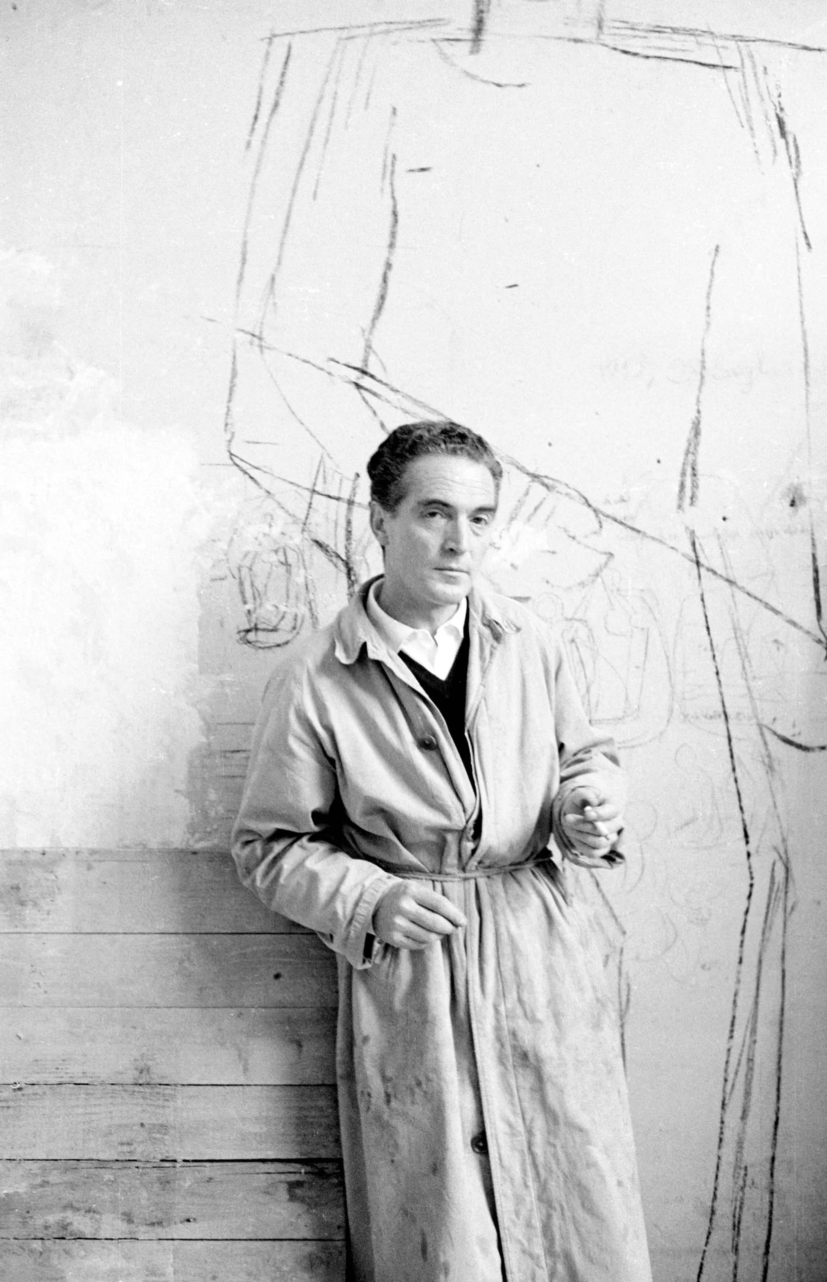 Black and white photograph of a man in a belted trench coat standing against a wall covered with large gestural figure drawings