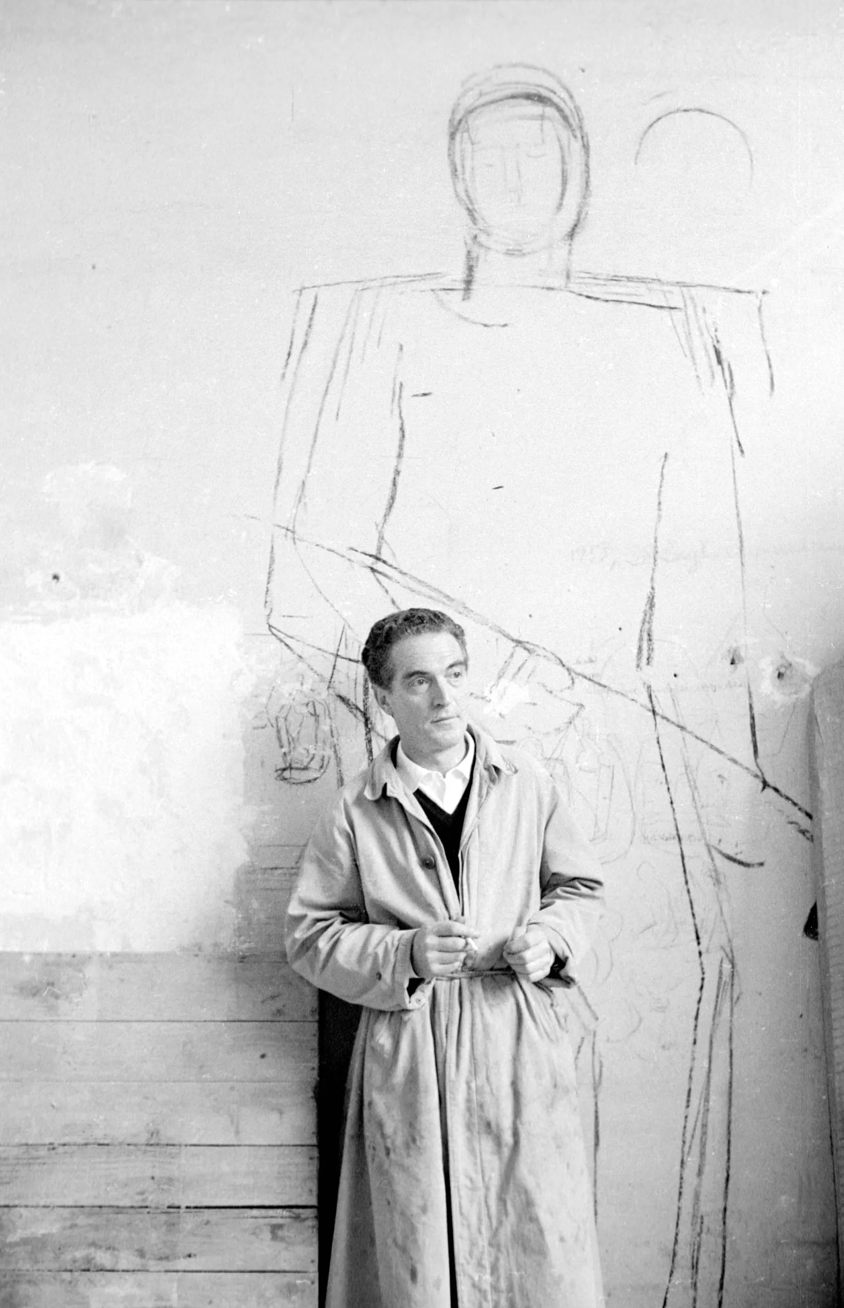Black and white photograph of a person in a trench coat standing in front of a large charcoal figure sketched on a plaster wall