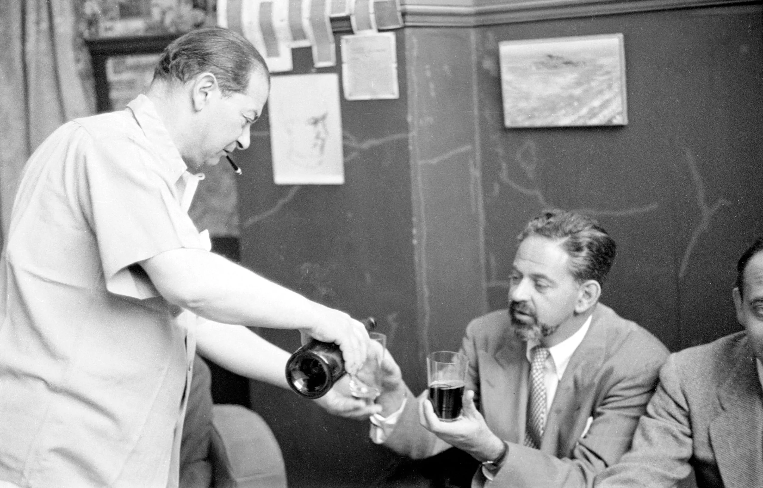 Black and white photograph of a standing man pouring dark liquid from a bottle into glasses held by a seated man in a suit and tie, indoors