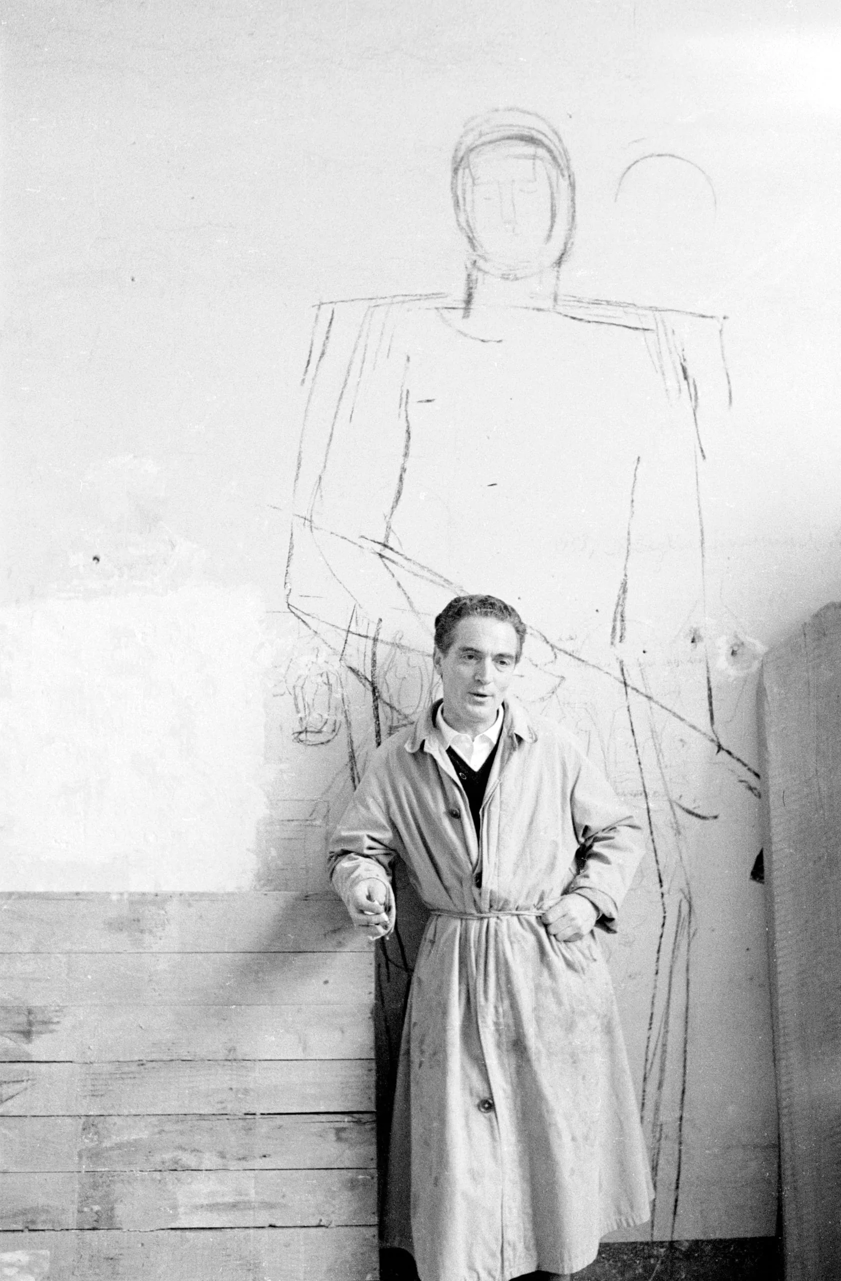 Black and white photograph of a man in a belted trench coat standing in a studio before a large, loose chalk figure drawing on a white wall