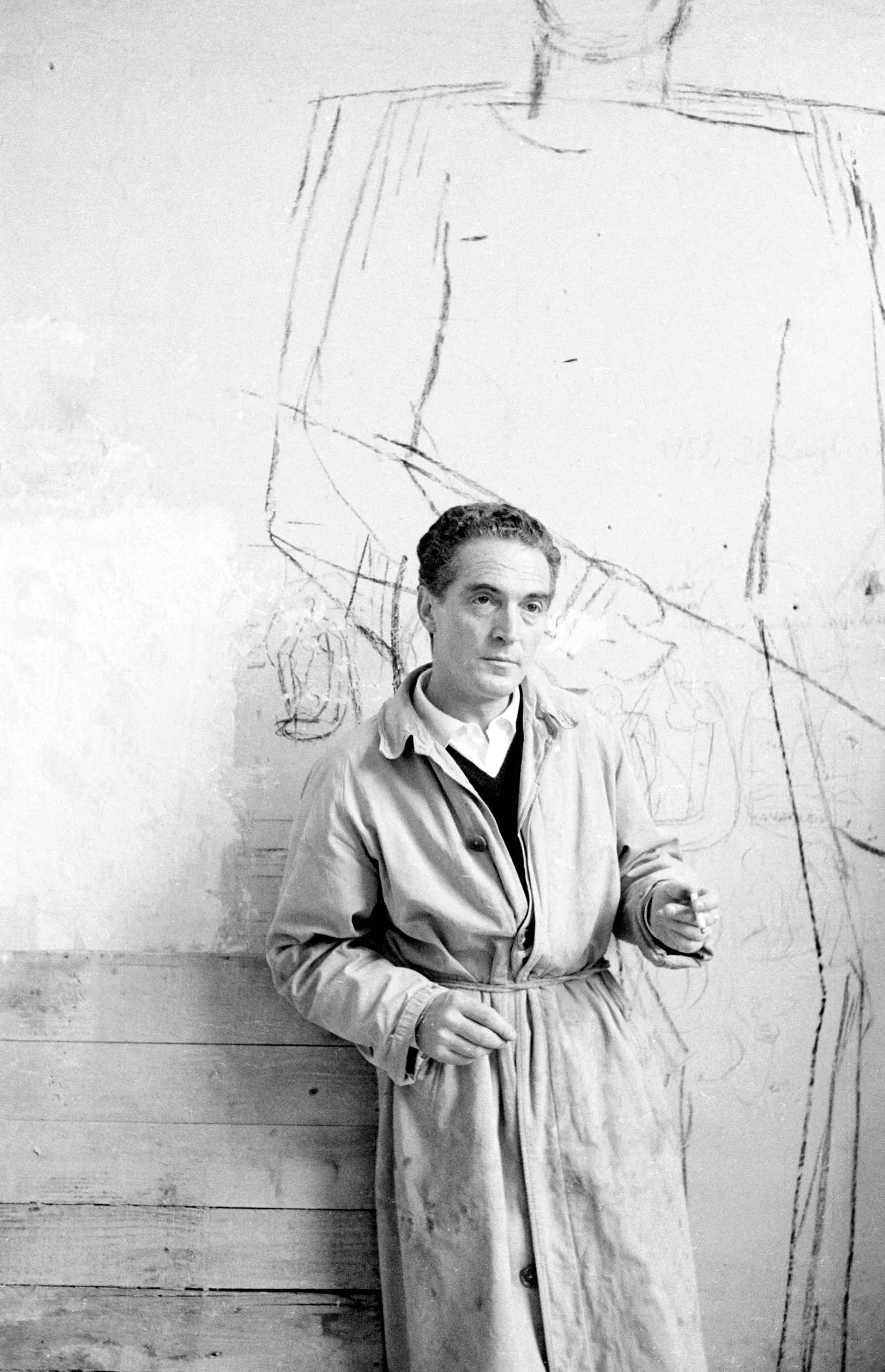 Black and white photograph of a man in a trench coat standing before a wall covered with large gestural charcoal figure drawings