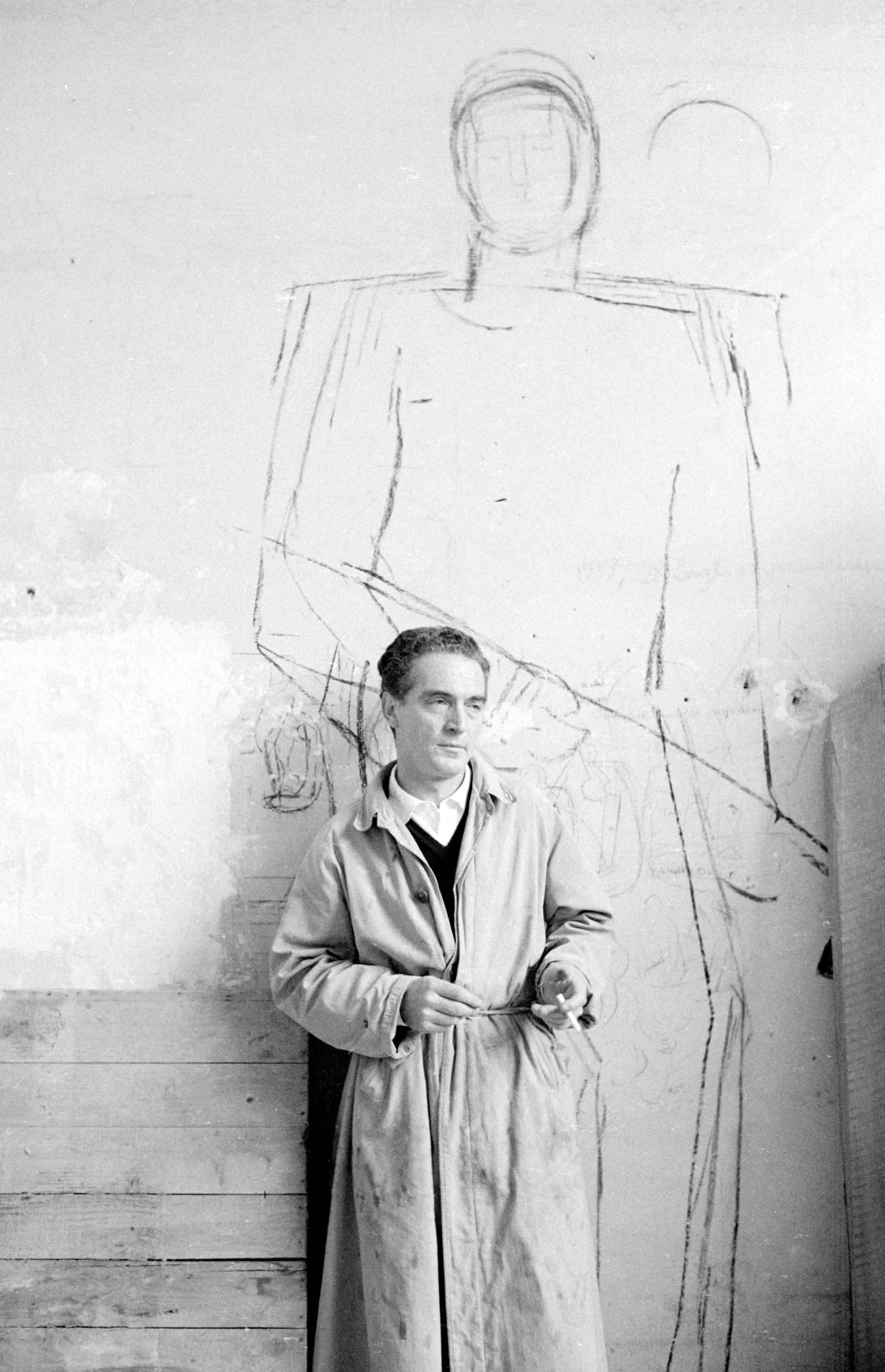Black and white photograph of a man in a long coat standing before a large-scale figure sketch drawn in chalk or charcoal directly on a plaster wall
