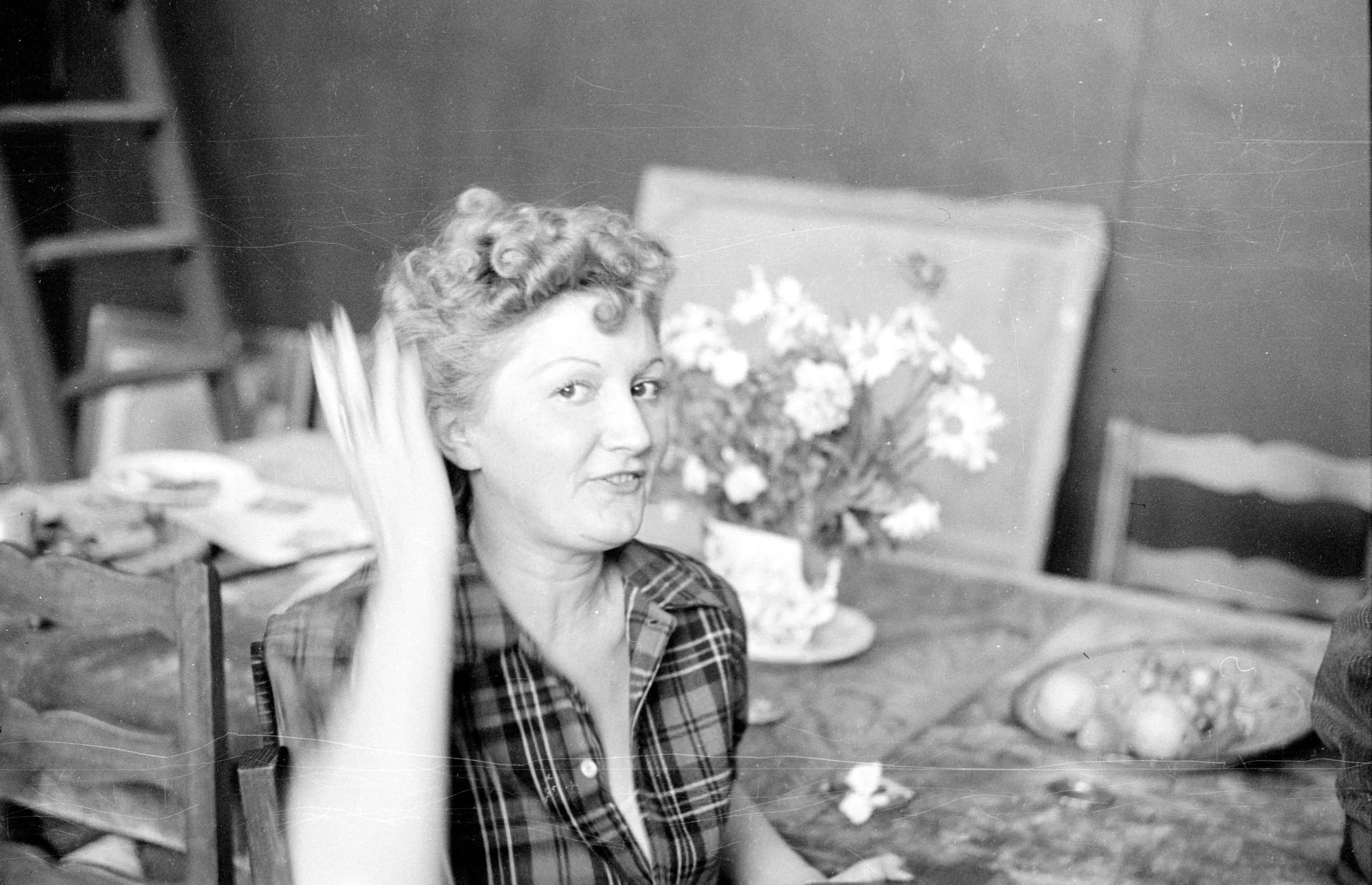 Black and white photograph of a white woman with curly pin-set hair, seated at a table, turning to speak, hand raised near face, with flowers and fruit visible behind her