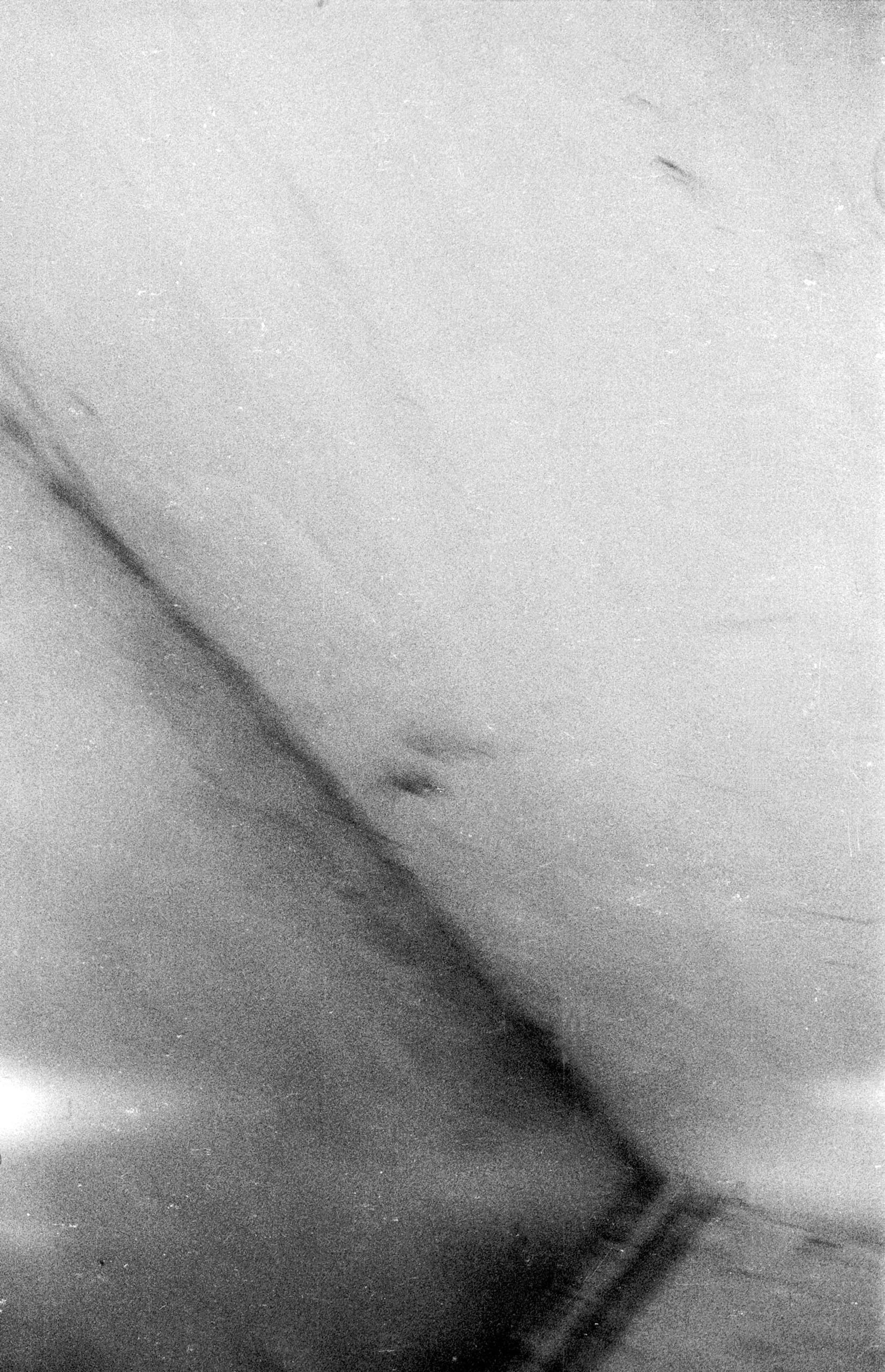 Black and white close-up photograph of a human torso, tightly cropped, with a diagonal skin fold dividing the frame and a bright light flare in the lower left corner